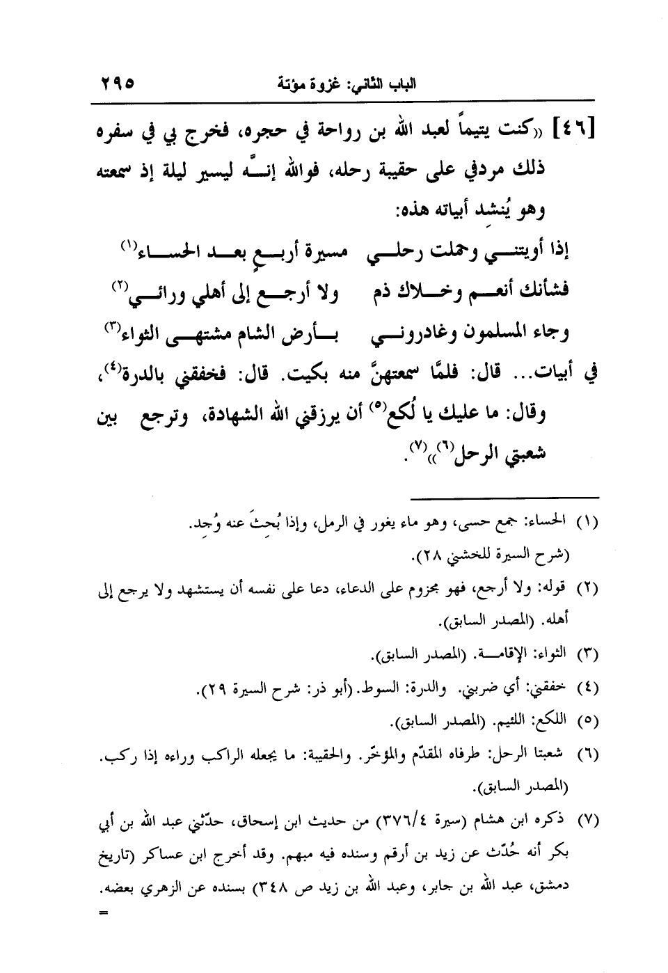 [46] "كنت يتيماً لعبد الله بن رواحة في حجره، فخرج بي في سفره ذلك مردفي على حقيبة رحله، فوالله إنه ليسير ليلة إذ سمعته وهو يُنشِد أبياته هذه: