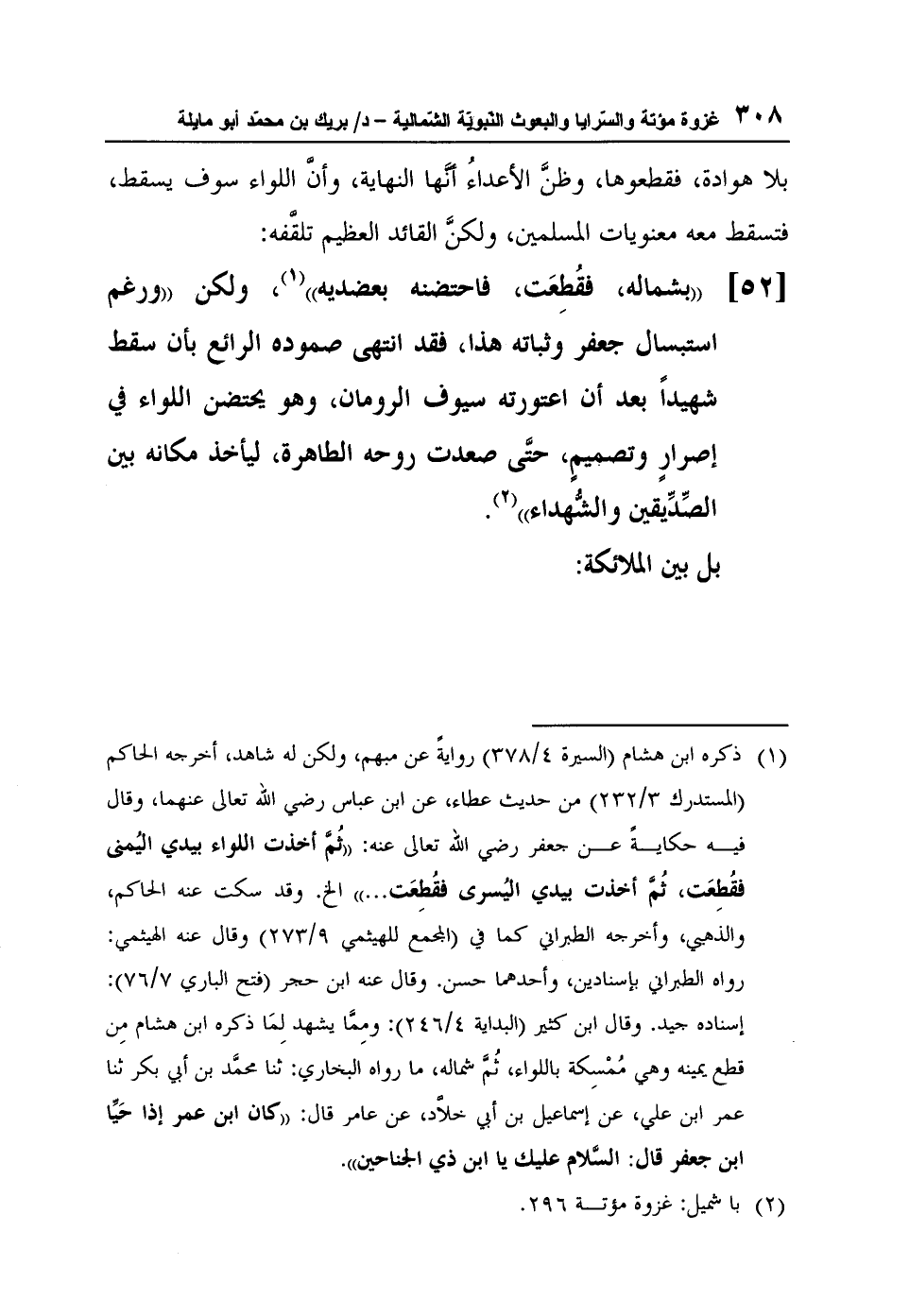 1 ذكره ابن هشام (السيرة 4/378) روايةً عن مبهم، ولكن له شاهد، أخرجه الحاكم (المستدرك 3/232) من حديث عطاء، عن ابن عباس رضي الله تعالى عنهما، وقال فيه حكايةً عن جعفر رضي الله تعالى عنه: ”ثُمَّ أخذت اللواء بيدي اليُمنى فقُطِعَت، ثُمَّ أخذت بيدي اليُسرى فقُطِعَت ... " الخ. وقد سكت عنه الحاكم، والذهبي، وأخرجه الطبراني كما في (المجمع للهيثمي 9/273) وقال عنه الهيثمي: رواه الطبراني بإسنادين، وأحدهما حسن. وقال عنه ابن حجر (فتح الباري 7/76) : إسناده جيد. وقال ابن كثير (البداية 4/246) : ومِمَّا يشهد لِمَا ذكره ابن هشام مِن قطع يمينه وهي مُمْسِكة باللواء، ثُمَّ شماله، ما رواه البخاري: ثنا محمَّد بن أبي بكر ثنا عمر ابن علي، عن إسماعيل بن أبي خلاَّد، عن عامر قال: "كان ابن عمر إذا حَيِّا ابن جعفر قال: السَّلام عليك يا ابن ذي الجناحين".