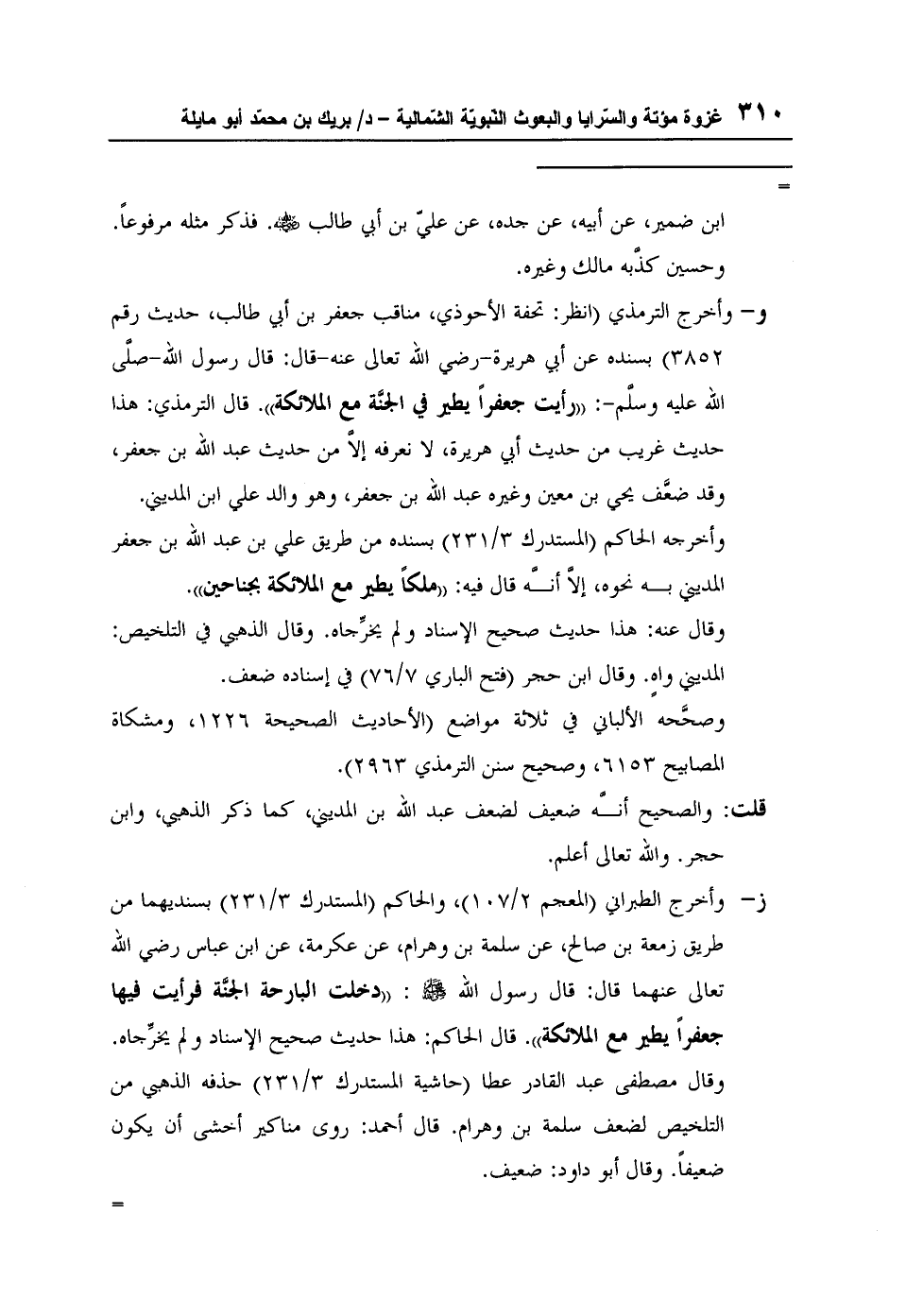ز- وأخرج الطبراني (المعجم 2/107) ، والحاكم (المستدرك 3/231) بسنديهما من طريق زمعة بن صالح، عن سلمة بن وهرام، عن عكرمة، عن ابن عباس رضي الله تعالى عنهما قال: قال رسول الله صلى الله عليه وسلم: "دخلت البارحة الجنَّة فرأيت فيها جعفراً يطير مع الملائكة". قال الحاكم: هذا حديث صحيح الإسناد ولم يخرِّجاه. وقال مصطفى عبد القادر عطا (حاشية المستدرك 3/231) حذفه الذهبي من التلخيص لضعف سلمة بن وهرام. قال أحمد: روى مناكير أخشى أن يكون ضعيفاً. وقال أبو داود: ضعيف.