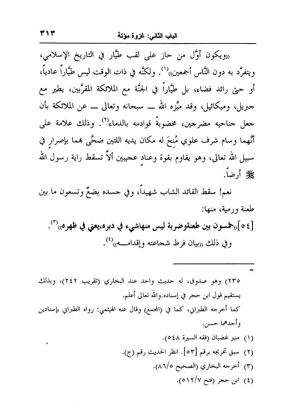 "ويكون أوَّل من حاز على لقب طيَّار في التاريخ الإسلامي، ويتفرَّد به دون النَّاس أجمعين"1. ولكنَّه في ذات الوقت ليس طيَّاراً عادياً، أو حتى رائد فضاء، بل طيَّاراً في الجنَّة مع الملائكة المقرَّبين، يطير مع جبريل، وميكائيل، وقد ميَّزه الله - سبحانه وتعالى - عن الملائكة بأن جعل جناحيه مضرجين، مخضوبةً قوادمه بالدماء2. وذلك علامة على أنَّهما وسام شرف علوي مُنِحَ له مكان يديه اللتين ضحَّى بهما بإصرارٍ في سبيل الله تعالى، وهو يقاوم بقوة وعنادٍ عجيبين ألاَّ تسقط راية رسول الله صلى الله عليه وسلم أرضاً.