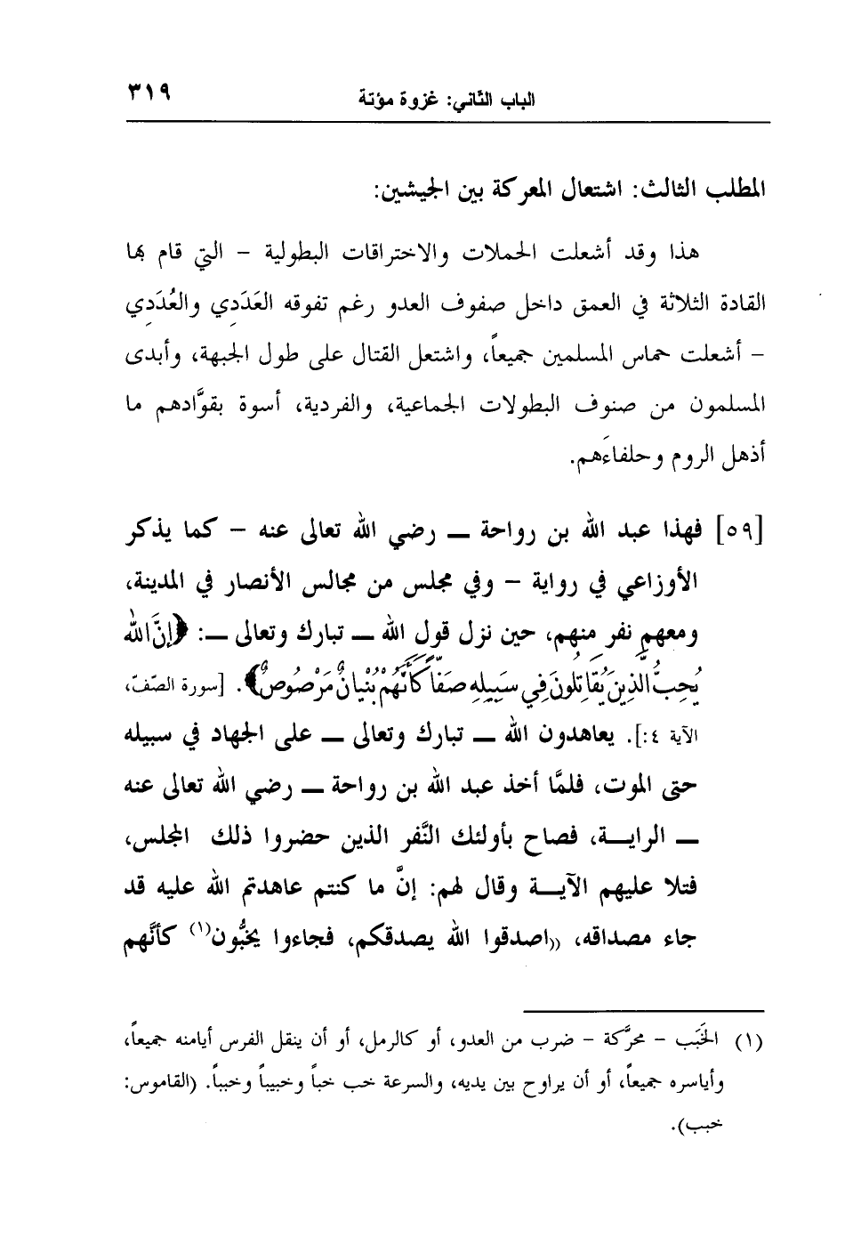 [59] فهذا عبد الله بن رواحة - رضي الله تعالى عنه - كما يذكر الأوزاعي في رواية - وفي مجلس من مجالس الأنصار في المدينة، ومعهم نفر منهم، حين نزل قول الله - تبارك وتعالى: {إنَّ الله يُحِبُّ الَّذِينَ يُقَاتِلُونَ فِي سَبِيلِهِ صَفّاً كَأَنهُمْ بُنْيانٌ مَرْصُوصٌ} . [سورة الصّفّ، الآية 4:] . يعاهدون الله - تبارك وتعالى - على الجهاد في سبيله حتى الموت، فلمَّا أخذ عبد الله بن رواحة - رضي الله تعالى عنه - الراية، فصاح بأولئك النَّفر الذين حضروا ذلك المجلس، فتلا عليهم الآية وقال لهم: إنَّ ما كنتم عاهدتم الله عليه قد جاء مصداقه، "اصدقوا الله يصدقكم، فجاءوا يخبُّون1 كأنَّهم