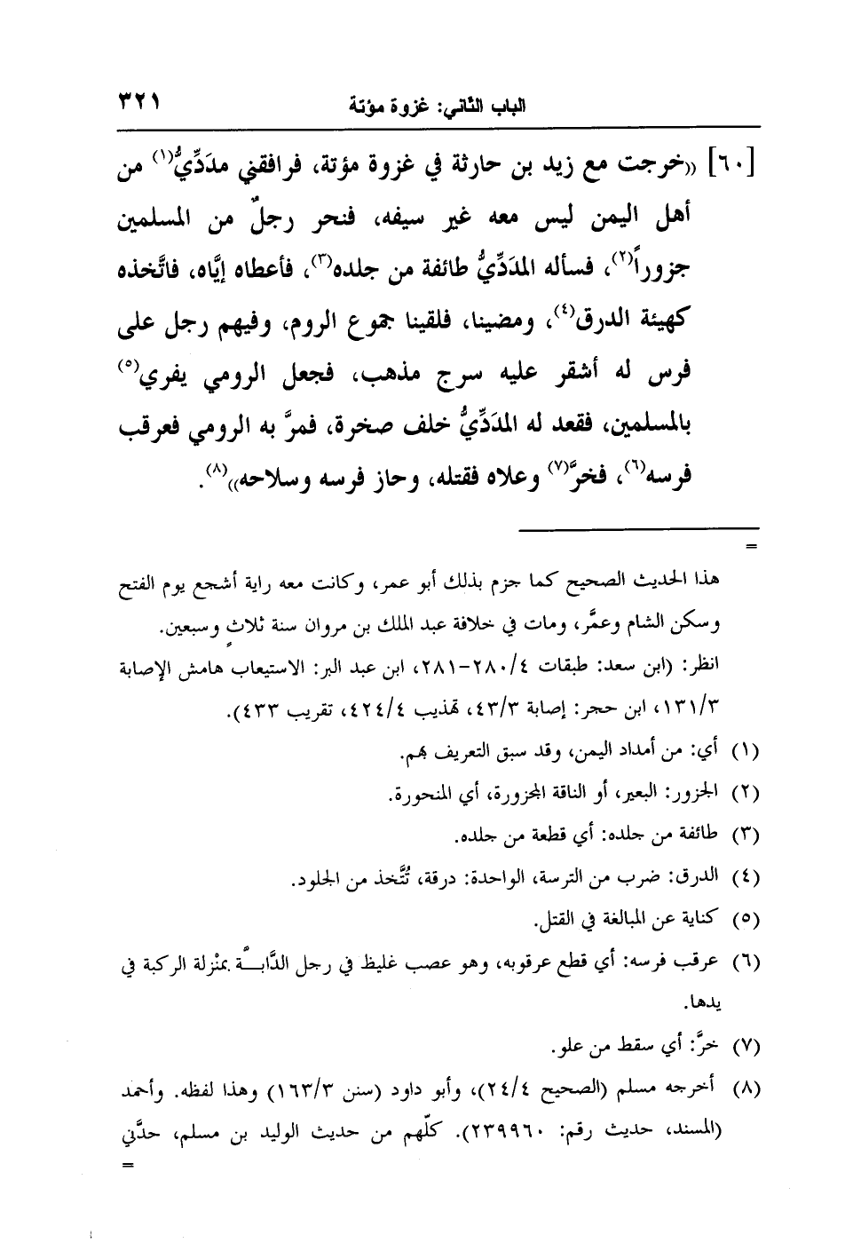 [60] "خرجت مع زيد بن حارثة في غزوة مؤتة، فرافقني مدَدِّيُّ1 من أهل اليمن ليس معه غير سيفه، فنحر رجلٌ من المسلمين جزوراً2، فسأله المدَدِّيُّ طائفة من جلده3، فأعطاه إيَّاه، فاتَّخذه كهيئة الدرق4، ومضينا، فلقينا جموع الروم، وفيهم رجل على فرس له أشقر عليه سرج مذهب، فجعل الرومي يفري5 بالمسلمين، فقعد له المدَدِّيُّ خلف صخرة، فمرَّ به الرومي فعرقب فرسه6، فخرَّ7 وعلاه فقتله، وحاز فرسه وسلاحه"8.