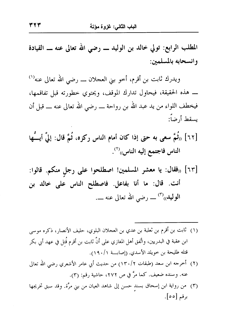 [63] "فقال: يا معشر المسلمين! اصطلحوا على رجلٍ منكم. قالوا: أنت. قال: ما أنا بفاعل. فاصطلح الناس على خالد بن الوليد"3 - رضي الله تعالى عنه.