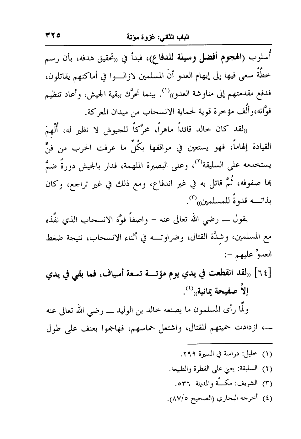 [64] "لقد انقطعت في يدي يوم مؤتة تسعة أسياف، فما بقي في يدي إلاَّ صفيحة يمانية"4.