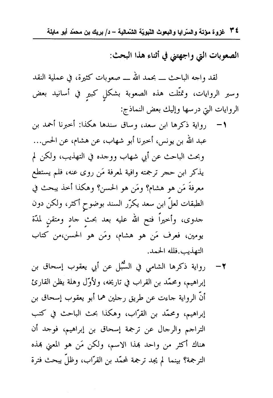 وبحث الباحث عن أبي شهاب ووجده في التهذيب، ولكن لم يذكر ابن حجر ترجمته وافية لمعرفة مَن روى عنه، فلم يستطع معرفةَ مَن هو هشام؟ ومَن هو الحسن؟ وهكذا أخذ يبحث في الطبقات لعلّ ابن سعد يكرّر السند بوضوحٍ أكثر، ولكن دون جدوى، وأخيراً فتح الله عليه بعد بحثٍ جادٍ ومتقنٍ لمدّة يومين، فعرف مَن هو هشام، ومَن هو الحسن، من كتاب التهذيب. فلله الحمد.