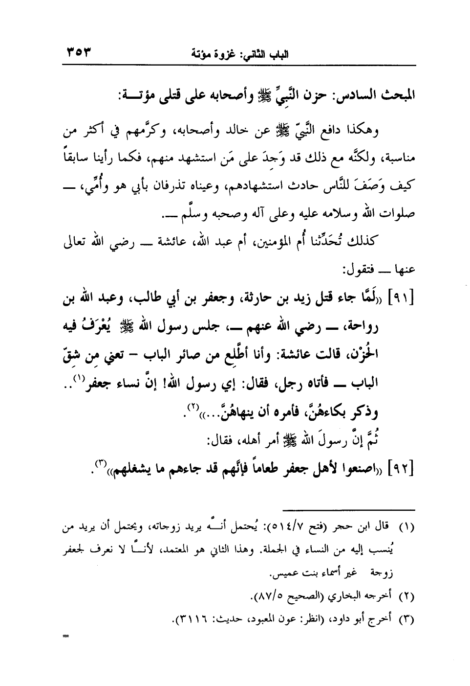 [91] "لَمَّا جاء قتل زيد بن حارثة، وجعفر بن أبي طالب، وعبد الله بن رواحة، - رضي الله عنهم، جلس رسول الله صلى الله عليه وسلم يُعْرَفُ فيه الحُزْن، قالت عائشة: وأنا أطَّلِع من صائر الباب - تعني مِن شِقّ الباب - فأتاه رجل، فقال: إي رسول الله! إنَّ نساء جعفر1.. وذكر بكاءهُنَّ، فأمره أن ينهاهُنَّ ... "2.