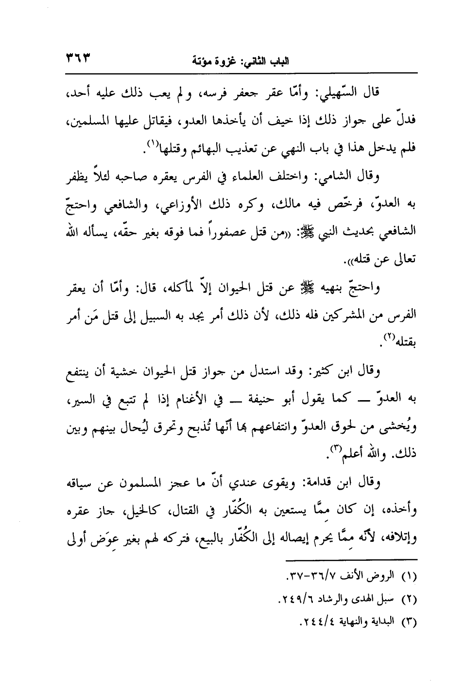 قال السّهيلي: "وأمّا عقر جعفر فرسه، ولم يعب ذلك عليه أحد، فدلّ على جواز ذلك إذا خيف أن يأخذها العدو، فيقاتل عليها المسلمين، فلم يدخل هذا في باب النهي عن تعذيب البهائم وقتلها1".