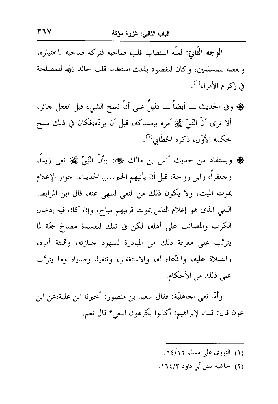 ويستفاد من حديث أنس بن مالك رضي الله عنه: "أنّ النّبيّ صلى الله عليه وسلم نعى زيداً، وجعفراً، وابن رواحة، قبل أن يأتيهم الخبر" ... الحديث. جواز الإعلام بموت الميت، ولا يكون ذلك من النعي المنهي عنه، قال ابن المرابط: "النعي الذي هو إعلام الناس بموت قريبهم مباح، وإن كان فيه إدخال الكرب والمصائب على أهله، لكن في تلك المفسدة مصالح جمّة لما يترتّب على معرفة ذلك من المبادرة لشهود جنازته، وتهيئة أمره، والصلاة عليه، والدّعاء له، والاستغفار، وتنفيذ وصاياه وما يترتّب على ذلك من الأحكام".