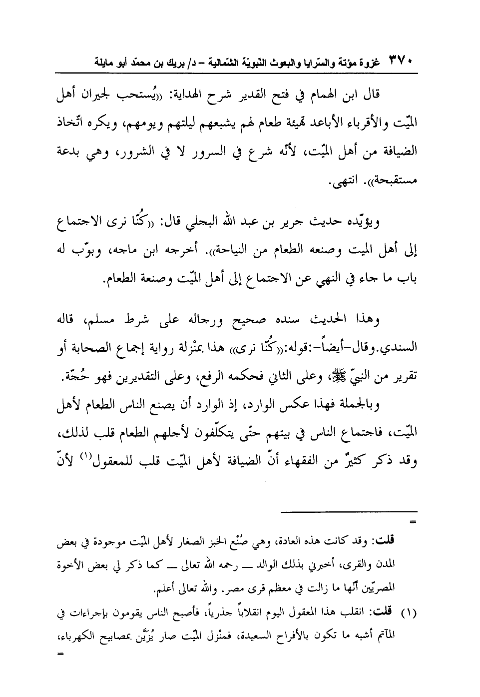 ويؤيّده حديث جرير بن عبد الله البجلي قال: "كُنّا نرى الاجتماع إلى أهل الميت وصنعه الطعام من النياحة". أخرجه ابن ماجه، وبوّب له باب ما جاء في النهي عن الاجتماع إلى أهل الميّت وصنعة الطعام".