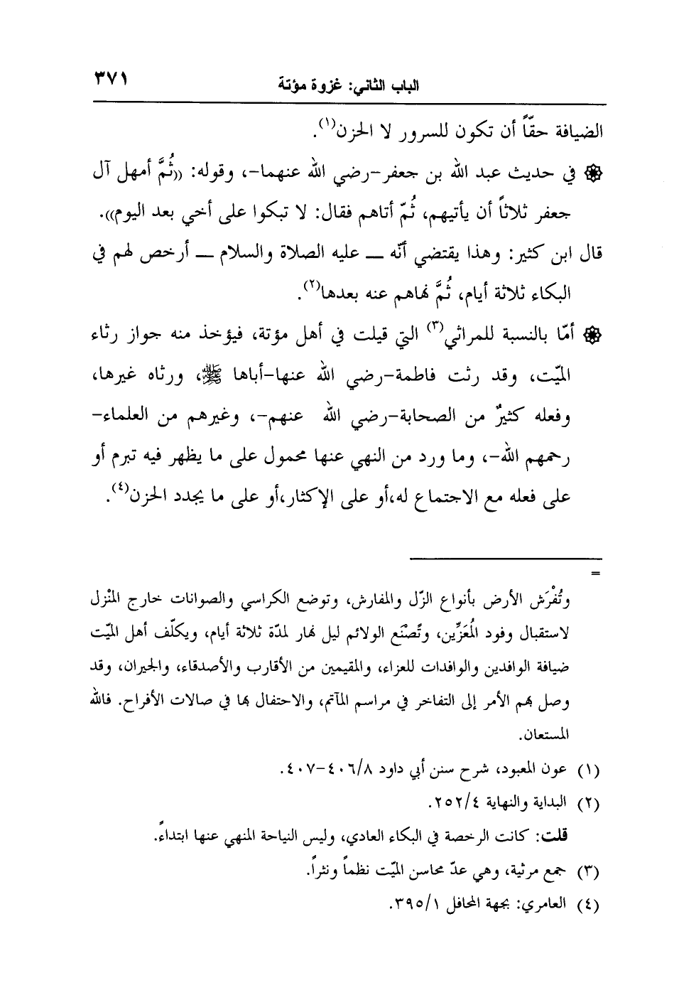 أمّا بالنسبة للمراثي3 التي قيلت في أهل مؤتة، فيؤخذ منه جواز رثاء الميّت، وقد رثت فاطمة - رضي الله عنها - أباها صلى الله عليه وسلم، ورثاه غيرها، وفعله كثيرٌ من الصحابة - رضي الله عنهم -، وغيرهم من العلماء - رحمهم الله -، وما ورد من النهي عنها محمول على ما يظهر فيه تبرم أو على فعله مع الاجتماع له، أو على الإكثار، أو على ما يجدد الحزن4".