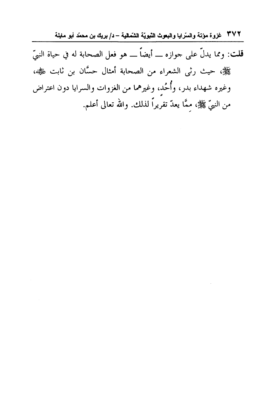 قلت: "ومما يدلّ على جوازه أيضاً هو فعل الصحابة له في حياة النبيّ صلى الله عليه وسلم، حيث رثى الشعراء من الصحابة أمثال حسَّان بن ثابت رضي الله عنه، وغيره شهداء بدر، وأُحُدٍ، وغيرهما من الغزوات والسرايا دون اعتراض من النبيّ صلى الله عليه وسلم، مِمَّا يعدّ تقريراً لذلك". والله تعالى أعلم".