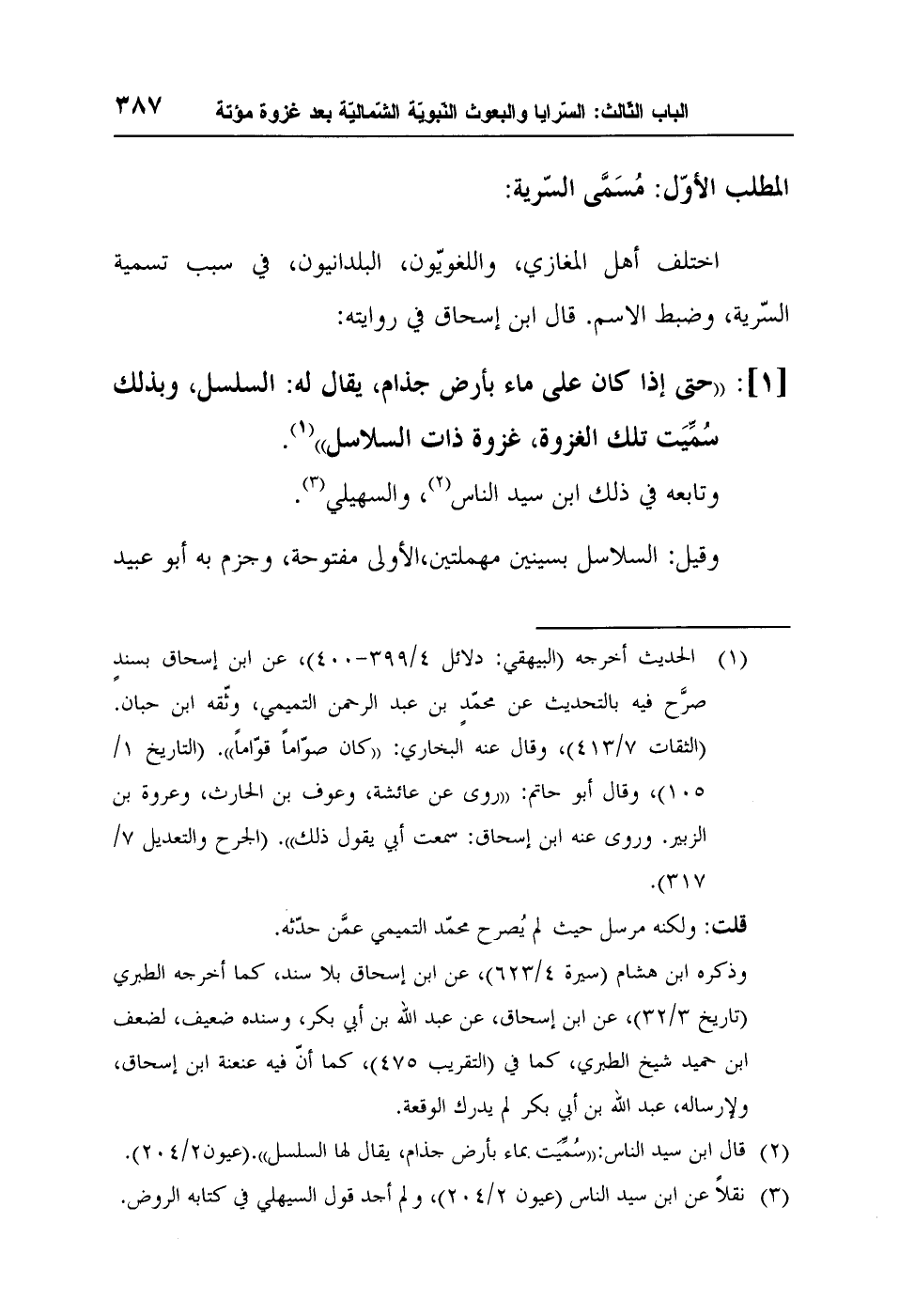 2 قال ابن سيد الناس:"سُمِّيَت بماء بأرض جذام، يقال لها السلسل". (عيون2/204) .