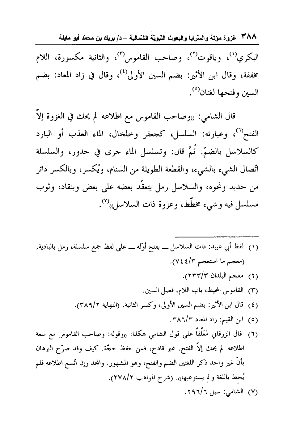 قال الشامي: "وصاحب القاموس مع اطلاعه لم يحك في الغزوة إلاّ الفتح6، وعبارته: السلسل، كجعفر وخلخال، الماء العذب أو البارد كالسلاسل بالضمّ. ثُمَّ قال: وتسلسل الماء جرى في حدور، والسلسلة اتّصال الشيء بالشيء، والقطعة الطويلة من السنام، ويُكسر، وبالكسر دائر من حديد ونحوه، والسلاسل رمل يتعقّد بعضه على بعض وينقاد، وثوب مسلسل فيه وشيء مخطّط، وعزوة ذات السلاسل"7.