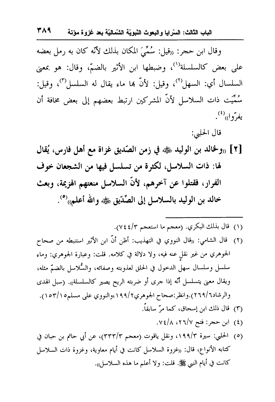 5 الحلبي: سيرة 3/199، ونقل ياقوت (معجم 3/333) ، عن أبي حاتم بن حبان في كتابه الأنواع، قال: "غزوة السلاسل كانت في أيام معاوية، وغزوة ذات السلاسل كانت في أيام النبي صلى الله عليه وسلم. قلت: ولا أعلم ما هذه السلاسل".