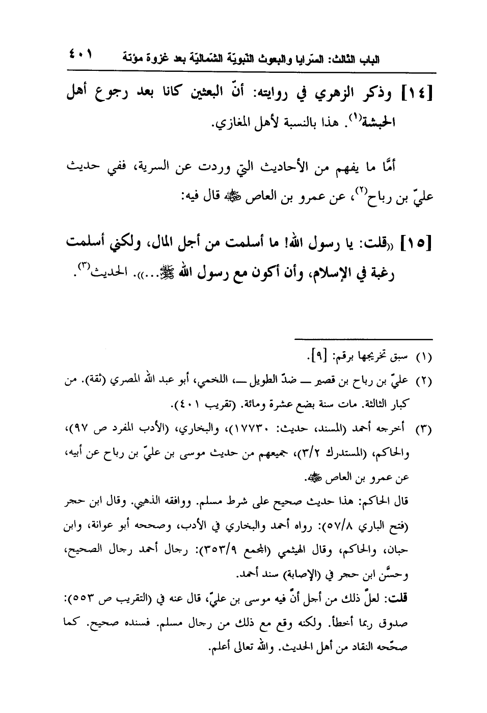 [15] "قلت: يا رسول الله! ما أسلمت من أجل المال، ولكني أسلمت رغبة في الإسلام، وأن أكون مع رسول الله صلى الله عليه وسلم ... ". الحديث3.