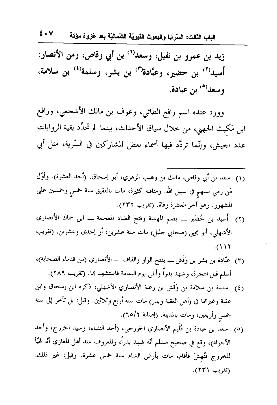 5 سعد بن عبادة بن دُلَيم الأنصاري الخزرجي، (أحد النقباء، وسيد الخزرج، وأحد الأجواد) ، وقع في صحيح مسلم أنّه شهد بدراً، والمعروف عند أهل المغازي أنّه تهيّأ للخروج فنُهِشَ فأقام، مات بأرض الشام سنة خمس عشرة. وقيل: غير ذلك. (تقريب 231) .