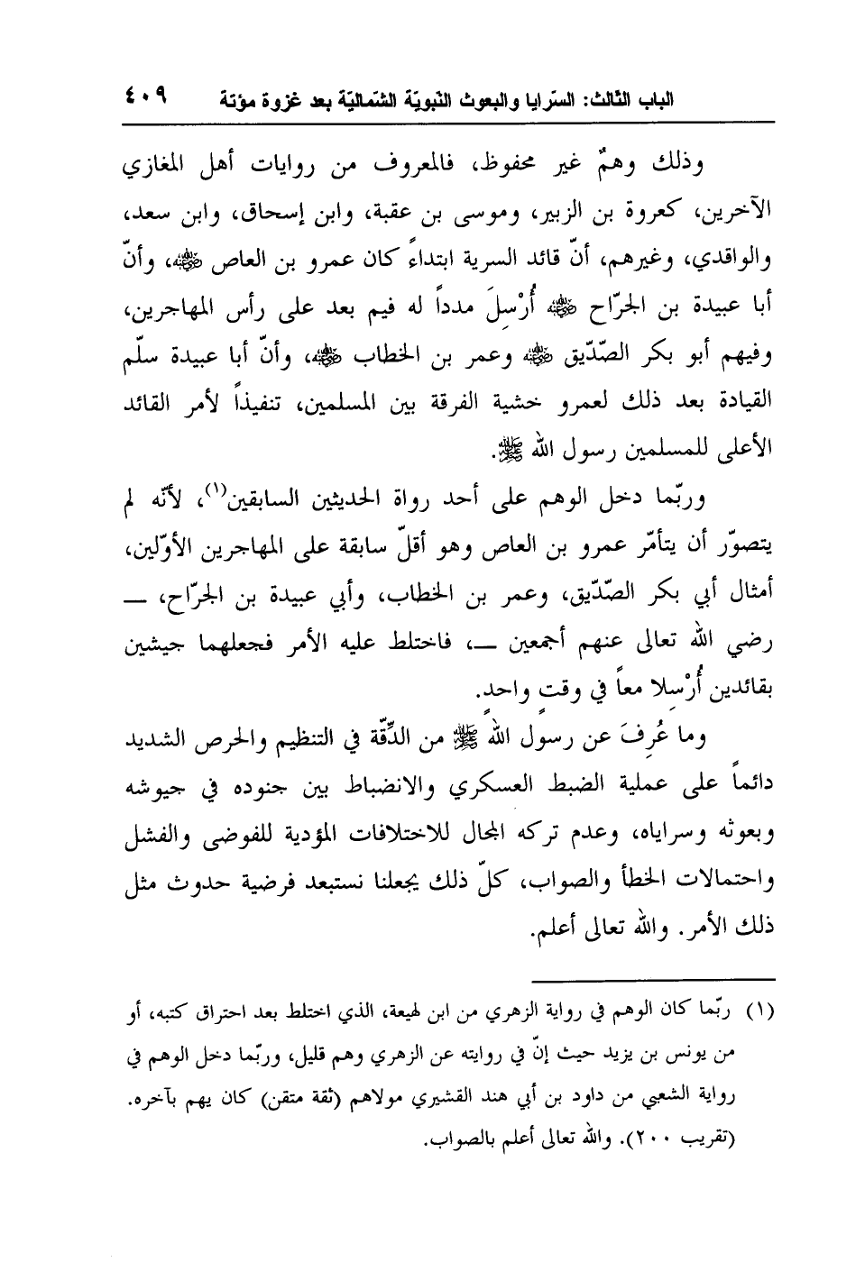 وربّما دخل الوهم على أحد رواة الحديثين السابقين1، لأنّه لم يتصوّر أن يتأمّر عمرو بن العاص وهو أقلّ سابقة على المهاجرين الأوّلين، أمثال أبي بكر الصّدّيق، وعمر بن الخطاب، وأبي عبيدة بن الجرّاح، - رضي الله تعالى عنهم أجمعين، فاختلط عليه الأمر فجعلهما جيشين بقائدين أُرْسِلا معاً في وقتٍ واحدٍ.