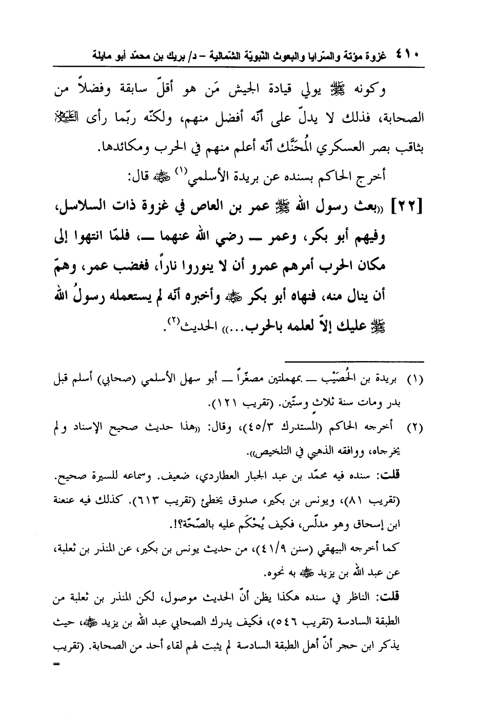 [22] "بعث رسول الله صلى الله عليه وسلم عمر بن العاص في غزوة ذات السلاسل، وفيهم أبو بكر، وعمر - رضي الله عنهما، فلمّا انتهوا إلى مكان الحرب أمرهم عمرو أن لا ينوروا ناراً، فغضب عمر، وهمّ أن ينال منه، فنهاه أبو بكر رضي الله عنه وأخبره أنّه لم يستعمله رسولُ الله صلى الله عليه وسلم عليك إلاّ لعلمه بالحرب ... " الحديث2.