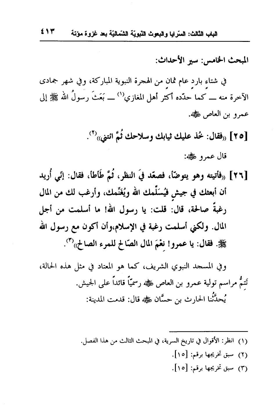 [26] "فأتيته وهو يتوضّأ، فصعّد فيَ النظر، ثُمَّ طَأطأ، فقال: إنّي أُريد أن أبعثك في جيشٍ فيُسَلِّمك الله ويُغَنِّمك، وأرغب لك من المال رغبةً صالحة، قال: قلت: يا رسول الله! ما أسلمت من أجل المال. ولكني أسلمت رغبة في الإسلام، وأن أكون مع رسول الله صلى الله عليه وسلم. فقال: يا عمرو! نِعْمَ المال الصّالح للمرء الصالح"3.