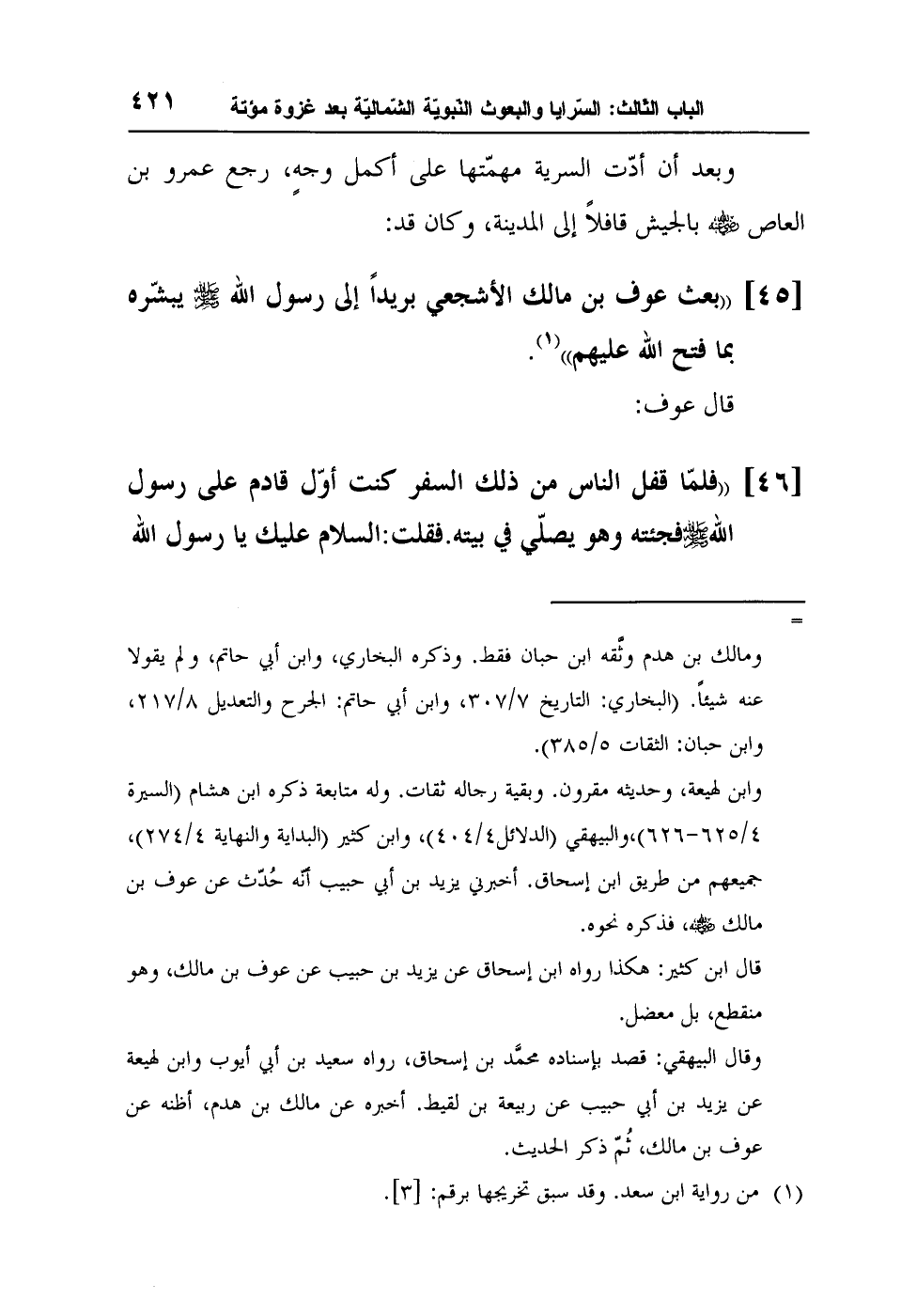 [45] "بعث عوف بن مالك الأشجعي بريداً إلى رسول الله صلى الله عليه وسلم يبشّره بما فتح الله عليهم"1.