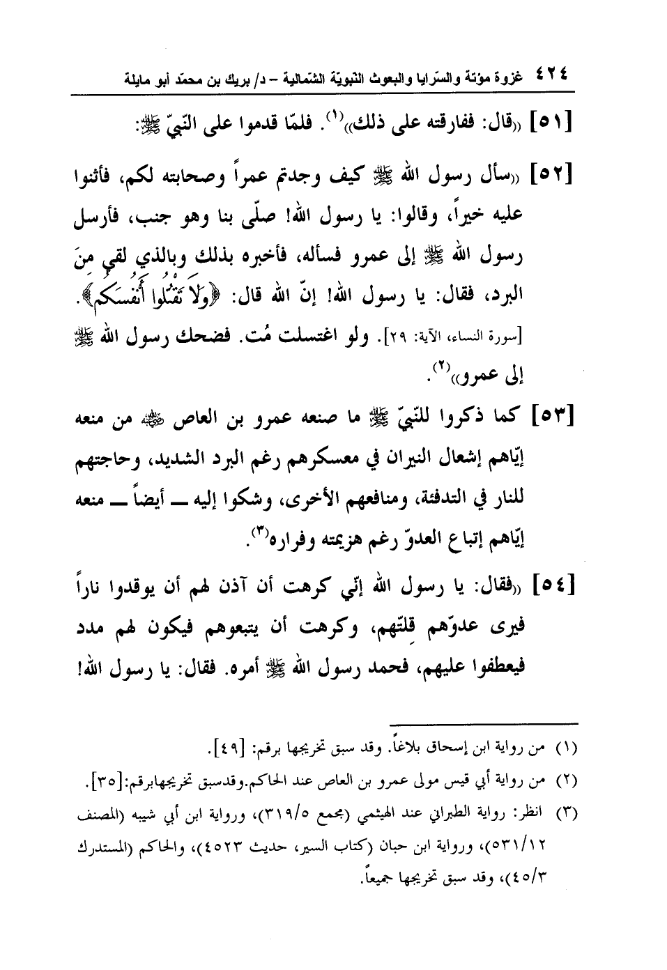 3 انظر: رواية الطبراني عند الهيثمي (مجمع 5/319) ، ورواية ابن أبي شيبه (المصنف 12/531) ، ورواية ابن حبان (كتاب السير، حديث 4523) ، والحاكم (المستدرك 3/45) ، وقد سبق تخريجها جميعاً.