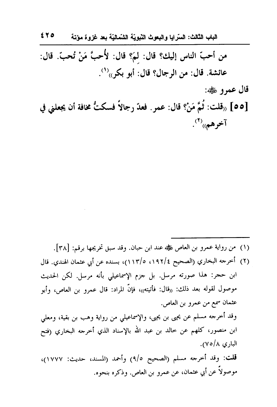 2 أخرجه البخاري (الصحيح 4/192، 5/113) ، بسنده عن أبي عثمان الهندي. قال ابن حجر: هذا صورته مرسل. بل جزم الإسماعيلي بأنه مرسل. لكن الحديث موصول لقوله بعد ذلك: "قال: فأتيته"، فإنّ المراد: قال عمرو بن العاص، وأبو عثمان سمع من عمرو بن العاص.