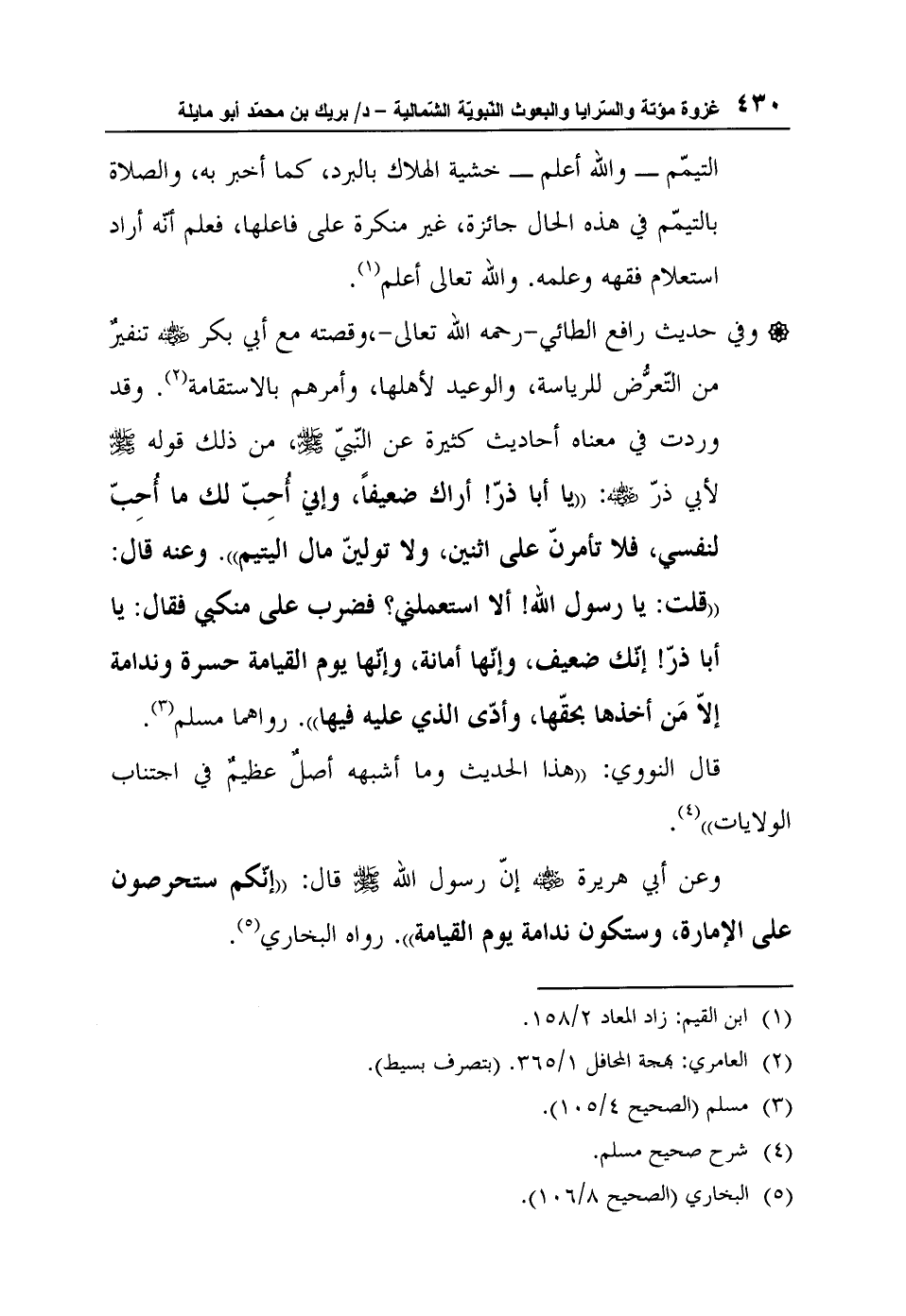 وفي حديث رافع الطائي-رحمه الله تعالى-،وقصته مع أبي بكر رضي الله عنه تنفيرٌ من التّعرُّض للرياسة، والوعيد لأهلها، وأمرهم بالاستقامة2. وقد وردت في معناه أحاديث كثيرة عن النّبيّ صلى الله عليه وسلم، من ذلك قوله صلى الله عليه وسلم لأبي ذرّ رضي الله عنه: "يا أبا ذرّ! أراك ضعيفاً، وإني أُحِبّ لك ما أُحِبّ لنفسي، فلا تأمرنّ على اثنين، ولا تولينّ مال اليتيم". وعنه قال: "قلت: يا رسول الله! ألا استعملني؟ فضرب على منكبي فقال: يا أبا ذرّ! إنّك ضعيف، وإنّها أمانة، وإنّها يوم القيامة حسرة وندامة إلاّ مَن أخذها بحقّها، وأدّى الذي عليه فيها". رواهما مسلم3.