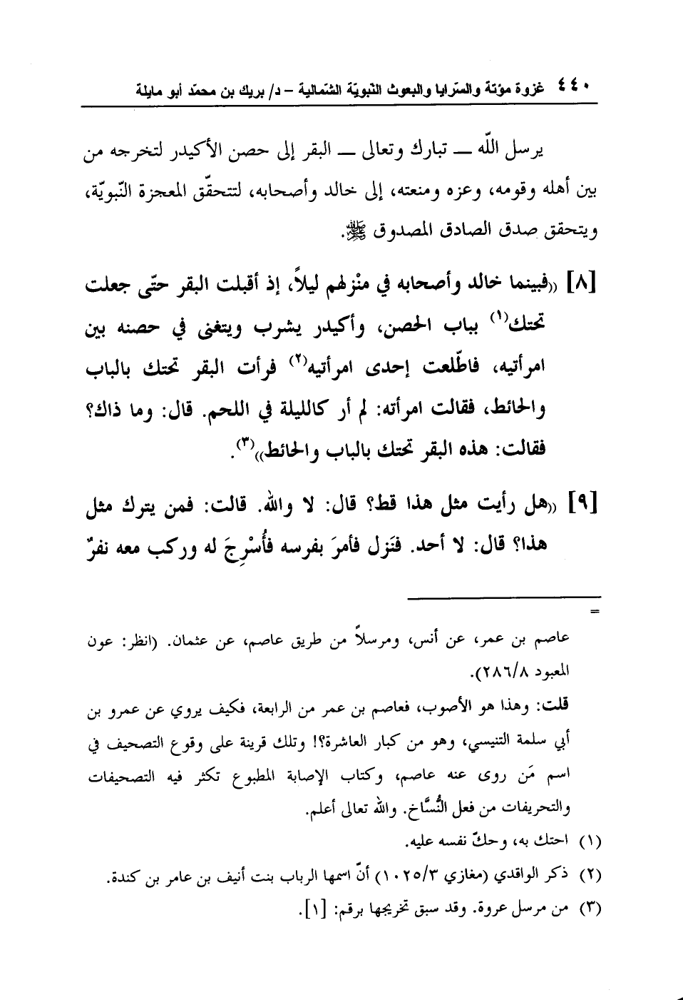 [9] "هل رأيت مثل هذا قط؟ قال: لا والله. قالت: فمن يترك مثل هذا؟ قال: لا أحد. فنَزل فأمرَ بفرسه فأُسْرِجَ له وركب معه نفرٌ