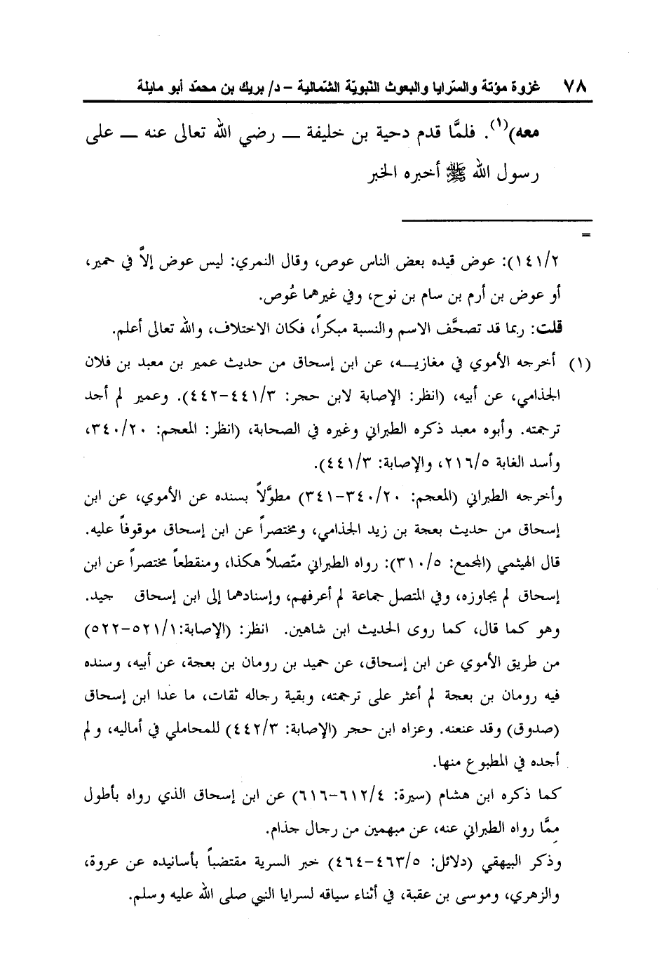 1 أخرجه الأموي في مغازيه، عن ابن إسحاق من حديث عمير بن معبد بن فلان الجذامي، عن أبيه، (انظر: الإصابة لابن حجر: 3/441-442) . وعمير لم أجد ترجمته. وأبوه معبد ذكره الطبراني وغيره في الصحابة، (انظر: المعجم: 20/340، وأسد الغابة 5/216، والإصابة: 3/441) .