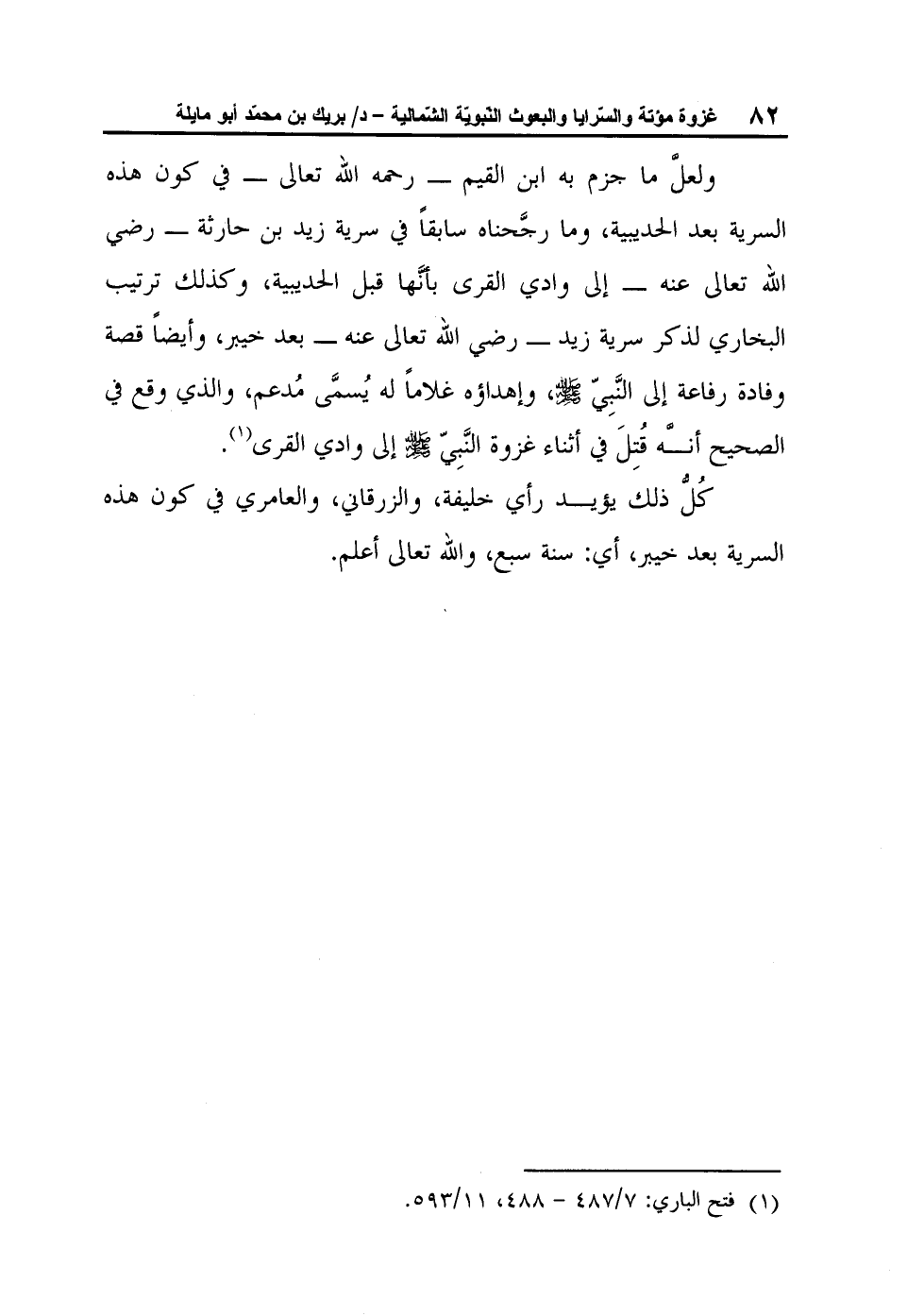 ولعلَّ ما جزم به ابن القيم - رحمه الله تعالى - في كون هذه السرية بعد الحديبية، وما رجَّحناه سابقاً في سرية زيد بن حارثة - رضي الله تعالى عنه - إلى وادي القرى بأنَّها قبل الحديبية، وكذلك ترتيب البخاري لذكر سرية زيد - رضي الله تعالى عنه - بعد خيبر، وأيضاً قصة وفادة رفاعة إلى النَّبِيّ صلى الله عليه وسلم، وإهداؤه غلاماً له يُسمَّى مُدعم، والذي وقع في الصحيح أنه قُتِلَ في أثناء غزوة النَّبِيّ صلى الله عليه وسلم إلى وادي القرى1.
