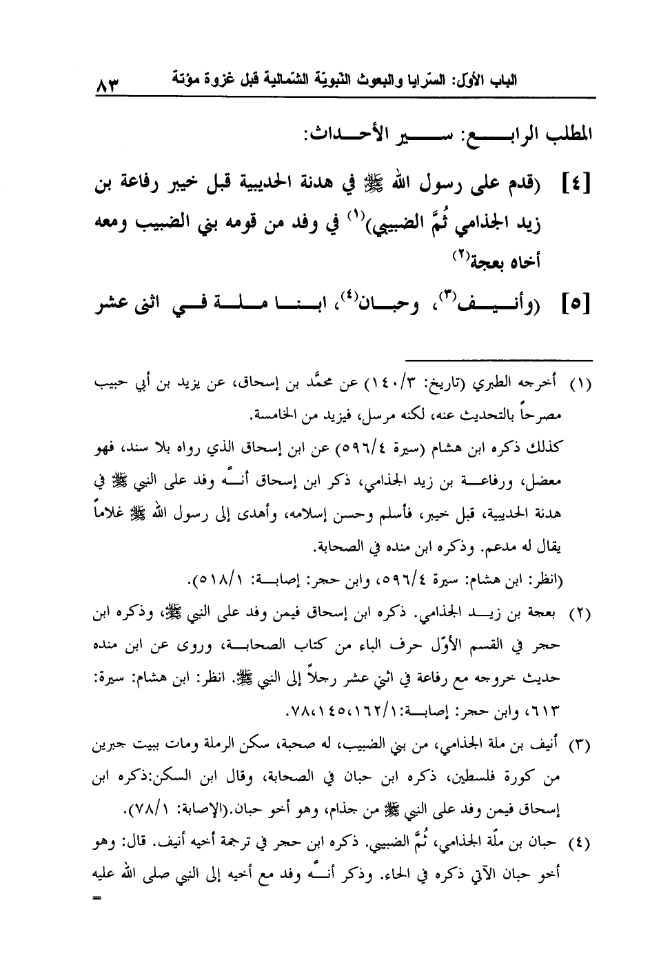 [4] "قدم على رسول الله صلى الله عليه وسلم في هدنة الحديبية قبل خيبر رفاعة بن زيد الجذامي ثُمَّ الضبيبي"1 في وفد من قومه بني الضبيب ومعه أخاه بعجة2