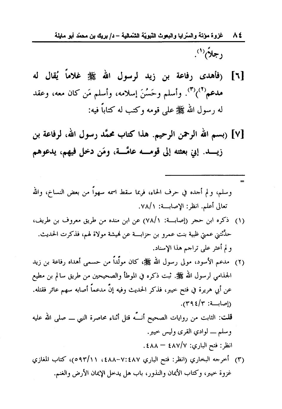 [7] "بسم الله الرحمن الرحيم. هذا كتاب محمَّد رسول الله، لرفاعة بن زيد. إني بعثته إلى قومه عامَّة، ومَن دخل فيهم، يدعوهم