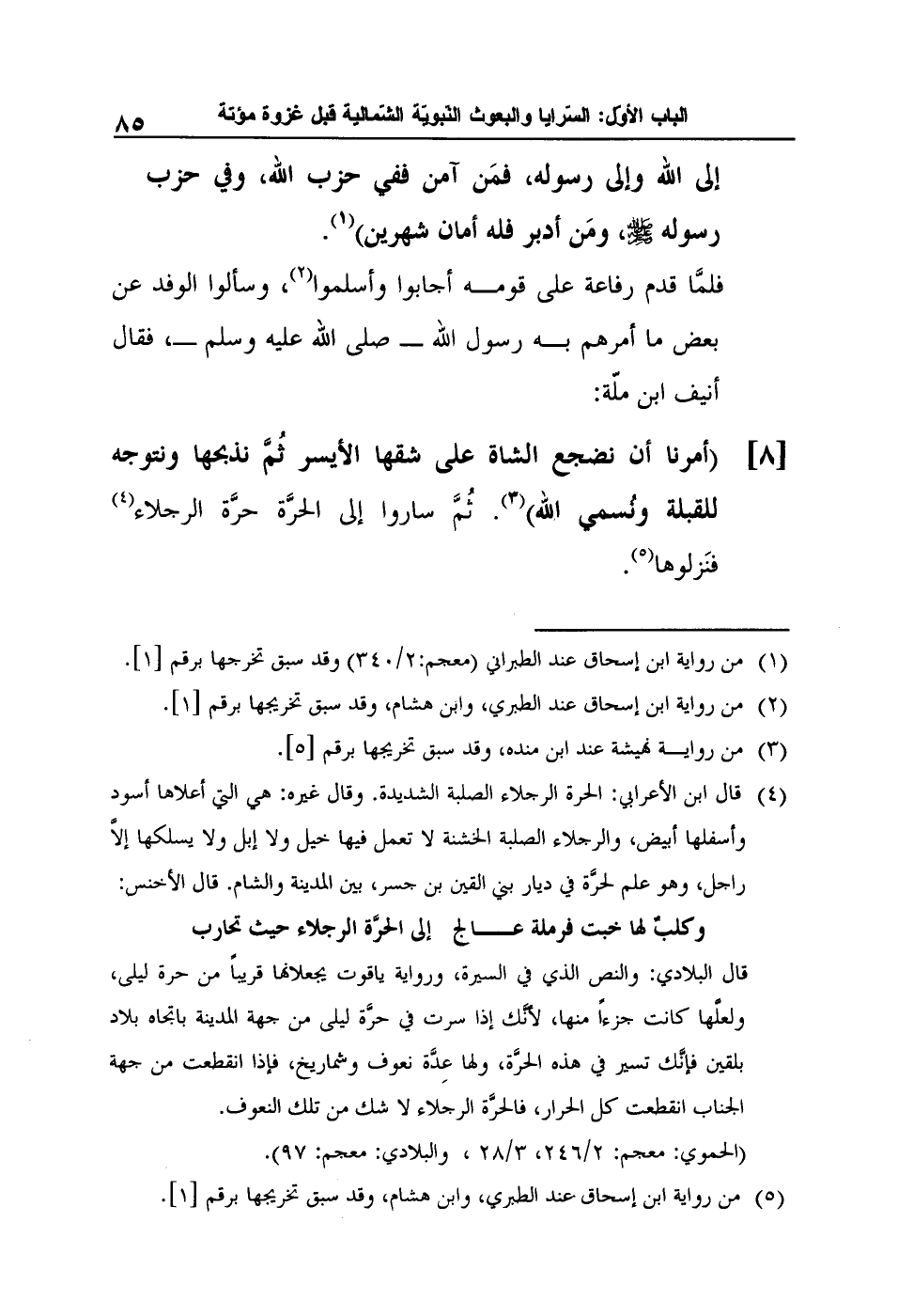 [8] "أمرنا أن نضجع الشاة على شقها الأيسر ثُمَّ نذبحها ونتوجه للقبلة ونُسمي الله"3. ثُمَّ ساروا إلى الحرَّة حرَّة الرجلاء4 فنَزلوها5.