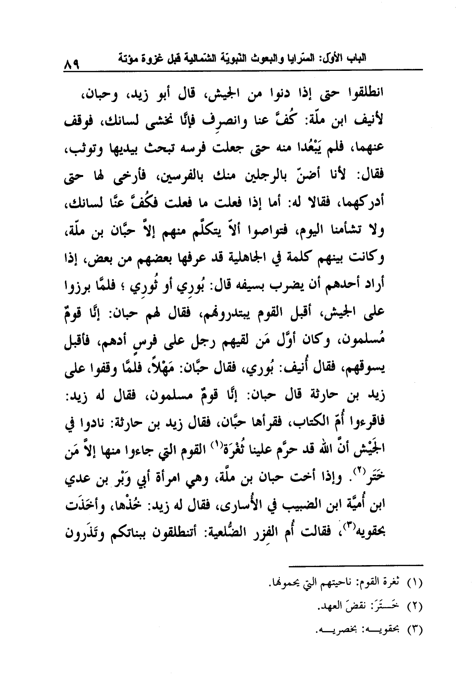 انطلقوا حتى إذا دنوا من الجيش، قال أبو زيد، وحبان، لأنيف ابن ملّة: كُفَّ عنا وانصرِف فإنَّا نخشى لسانك، فوقف عنهما، فلم يَبْعُدا منه حتى جعلت فرسه تبحث بيديها وتوثب، فقال: لأنا أضنّ بالرجلين منك بالفرسين، فأرخى لها حتى أدركهما، فقالا له: أما إذا فعلت ما فعلت فكُفَّ عنَّا لسانك، ولا تشأمنا اليوم، فتواصوا ألاّ يتكلَّم منهم إلاَّ حبَّان بن ملّة، وكانت بينهم كلمة في الجاهلية قد عرفها بعضهم من بعض، إذا أراد أحدهم أن يضرب بسيفه قال: بُورِي أو ثُورِي؛ فلمَّا برزوا على الجيش، أقبل القوم يبتدرونهم، فقال لهم حبان: إنَّا قومٌ مُسلمون، وكان أوَّل مَن لقيهم رجل على فرسٍ أدهم، فأقبل يسوقهم، فقال أُنيف: بُوري، فقال حبَّان: مَهْلاً، فلمَّا وقفوا على زيد بن حارثة قال حبان: إنَّا قومٌ مسلمون، فقال له زيد: فاقرءوا أُمّ الكتاب، فقرأها حبَّان، فقال زيد بن حارثة: نادوا في الجَيْش أنَّ الله قد حرَّم علينا ثُغْرَة1 القوم التي جاءوا منها إلاَّ مَن خَتَر2. وإذا أخت حبان بن ملَّة، وهي امرأة أبي وَبْر بن عدي ابن أُميَّة ابن الضبيب في الأُسارى، فقال له زيد: خُذْها، وأخَذَت بحقويه3، فقالت أُم الفِزر الضُّلعية: أتنطلقون ببناتكم وتَذَرون