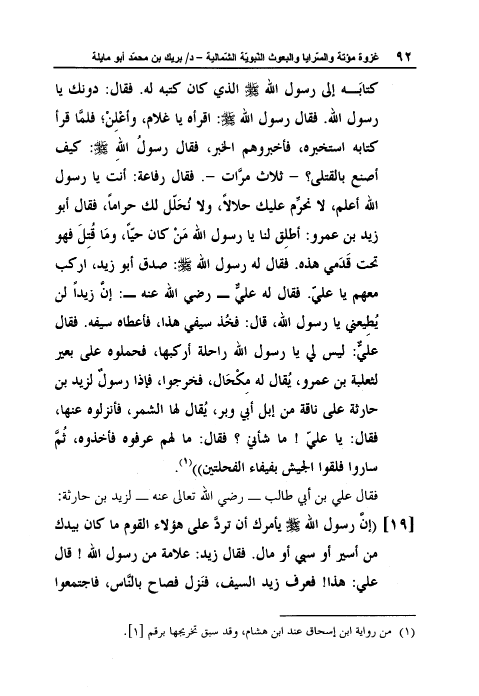 [19] "إنَّ رسول الله صلى الله عليه وسلم يأمرك أن تردَّ على هؤلاء القوم ما كان بيدك من أسير أو سبي أو مال. فقال زيد: علامة من رسول الله! قال علي: هذا! فعرف زيد السيف، فنَزل فصاح بالنَّاس، فاجتمعوا