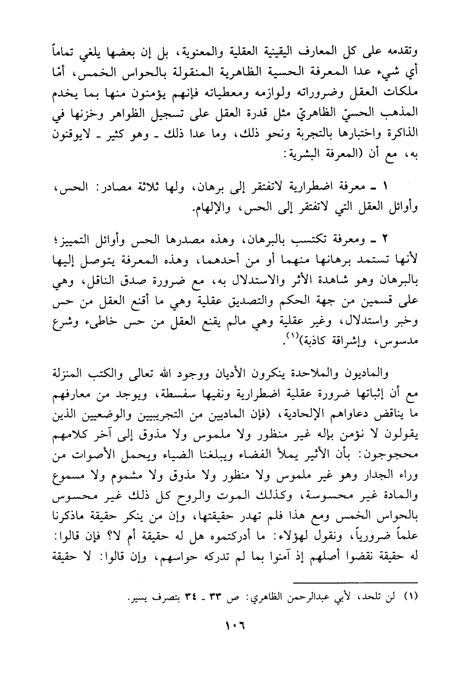 والماديون والملاحدة ينكرون الأديان ووجود اللَّه تعالى والكتب المنزلة مع أن إثباتها ضرورة عقلية اضطرارية ونفيها سفسطة، ويوجد من معارفهم ما يناقض دعاواهم الإلحادية، (فإن الماديين من التجريبيين والوضعيين الذين يقولون لا نؤمن بإله غير منظور ولا ملموس ولا مذوق إلى آخر كلامهم محجوجون: بأن الأثير يملأ الفضاء ويبلغنا الضياء ويحمل الأصوات من وراء الجدار وهو غير ملموس ولا منظور ولا مذوق ولا مشموم ولا مسموع والمادة غير محسوسة، وكذلك الموت والروح كل ذلك غير محسوس بالحواس الخمس ومع هذا فلم تهدر حقيقتها، وإن من ينكر حقيقة ما ذكرنا علمًا ضروريًا، ونقول لهؤلاء: ما أدركتموه هل له حقيقة أم لا؟ فإن قالوا: له حقيقة نقضوا أصلهم إذ آمنوا بما لم تدركه حواسهم، وإن قالوا: لا حقيقة