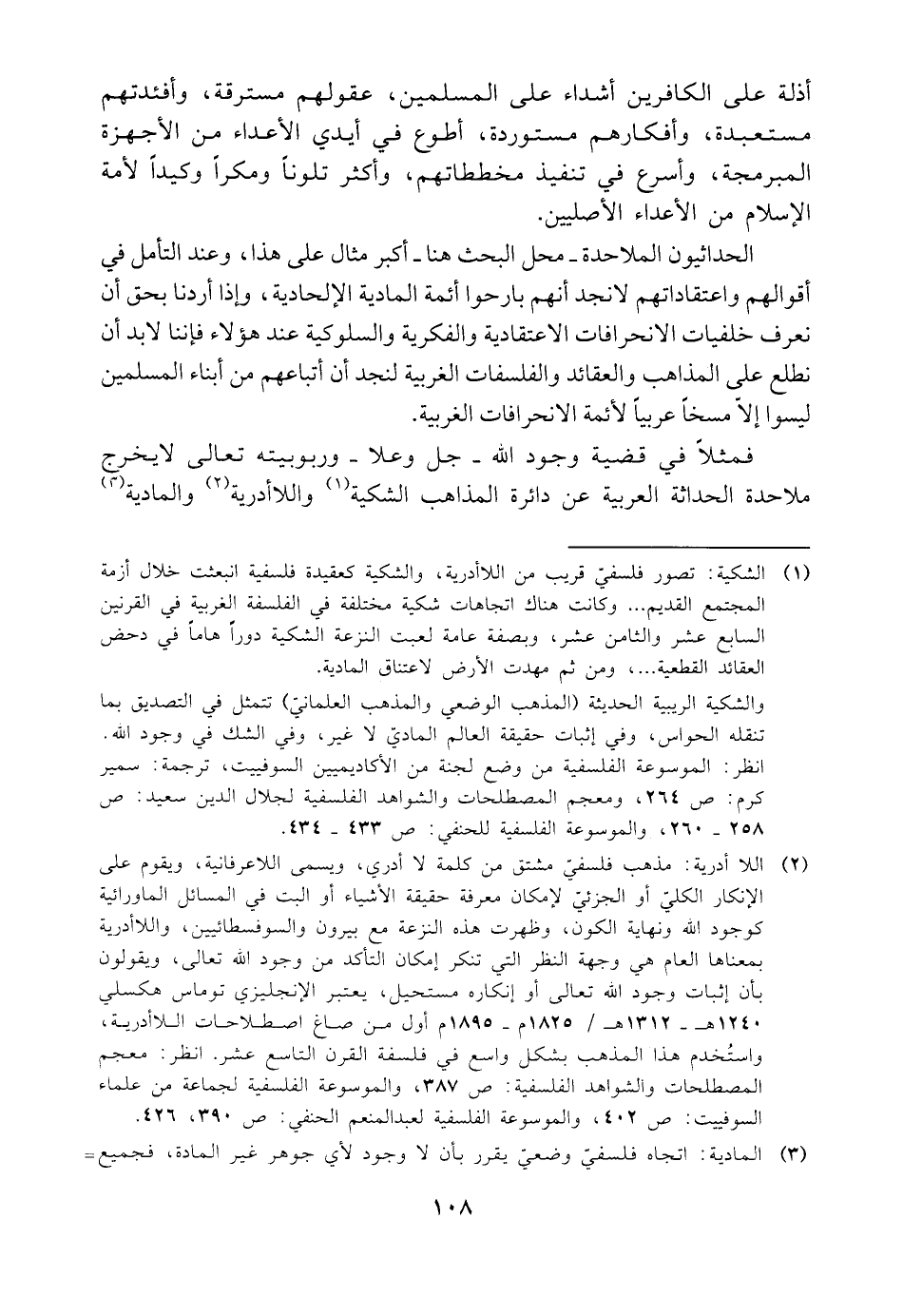 فمثلًا في قضية وجود اللَّه -جل وعلا- وربوبيته تعالى لا يخرج ملاحدة الحداثة العربية عن دائرة المذاهب الشكية (¬١) واللاأدرية (¬٢) والمادية (¬٣)