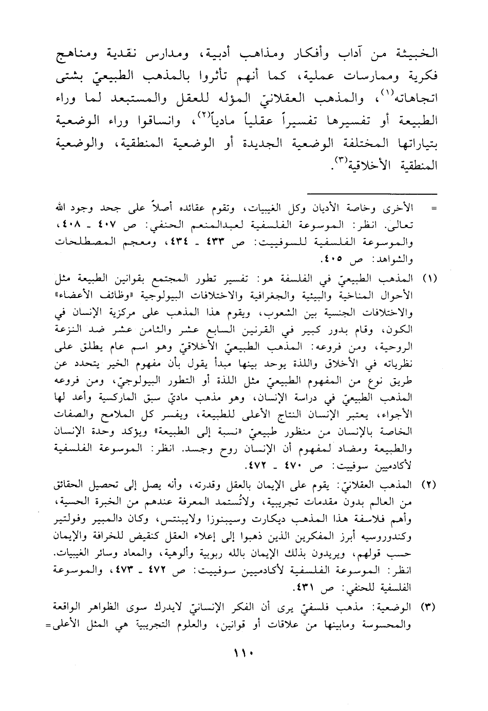 (¬١) المذهب الطبيعيّ في الفلسفة هو: تفسير تطور المجتمع بقوانين الطبيعة مثل الأحوال المناخية والبيئية والجغرافية والاختلافات البيولوجية "وظائف الأعضاء" والاختلافات الجنسية بين الشعوب، ويقوم هذا المذهب على مركزية الإنسان في الكون، وقام بدور كبير في القرنين السابع عشر والثامن عشر ضد النزعة الروحية، ومن فروعه: المذهب الطبيعي الأخلاقيّ وهو اسم عام يطلق على نظرياته في الأخلاق واللذة يوحد بينها مبدأ يقول بأن مفهوم الخير يتحدد عن طريق نوع من المفهوم الطبيعيّ مثل اللذة أو التطور البيولوجي، ومن فروعه المذهب الطبيعي في دراسة الإنسان، وهو مذهب ماديّ سبق الماركسية وأعد لها الأجواء، يعتبر الإنسان النتاج الأعلى للطبيعة، ويفسر كل الملامح والصفات الخاصة بالإنسان من منظور طبيعي "نسبة إلى الطبيعة" ويوْكد وحدة الإنسان والطبيعة ومضاد لمفهوم أن الإنسان روح وجسد. انظر: الموسوعة الفلسفية لأكادميين سوفييت: ص ٤٧٠ - ٤٧٢.