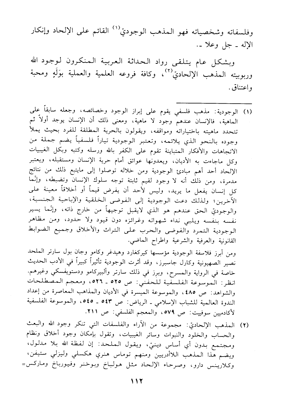 (¬١) الوجودية: مذهب فلسفي يقوم على إبراز الوجود وخصائصه، وجعله سابقًا على الماهية، فالإنسان عندهم وجود لا ماهية، ومعنى ذلك أن الإنسان يوجد أولًا ثم تتحدد ماهيته باختياراته ومواقفه، ويقولون بالحرية المطلقة للفرد بحيث يملأ وجوده بالنحو الذي يلائمه، وتعتبر الوجودية تيارًا فلسفيًا يضم جملة من الاتجاهات والأفكار المتباينة تقوم على الكفر باللَّه ورسله وكتبه وبكل الغيبيات وكل ما جاءت به الأديان، ويعدونها عوائق أمام حرية الإنسان ومستقبله، ويعتبر الإلحاد أحد أهم مبادئ الوجودية ومن خلاله توصلوا إلى ما يتبع ذلك من نتائج مدمرة، ومن ذلك أنه لا وجود لقيم ثابتة توجه سلوك الإنسان وتضبطه، وإنّما كل إنسان يفعل ما يريد، وليس لأحد أن يفرض قيمًا أو أخلاقًا معينة على الآخرين؛ ولذلك دعت الوجودية إلى الفوضى الخلقية والإباحية الجنسية، والوجوديّ الحق عندهم هو الذي لا يقبل توجيهًا من خارج ذاته، وإنّما يسير نفسه بنفسه ويلبي نداء شهواته وغرائزه دون قيود ولا حدود، ومن مظاهر الوجودية التمرد والفوضى والحرب على التراث والأخلاق وجميع الضوابط القانونية والعرفية والشرعية واطراح الماضي.