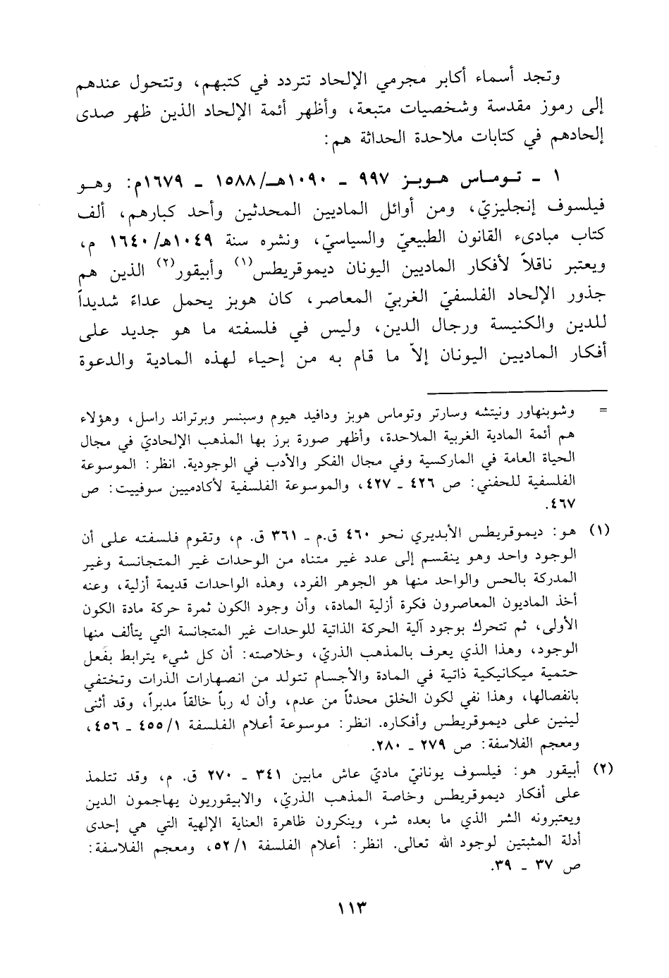 ١ - توماس هوبز ٩٩٧ - ١٠٩٠ هـ/ ١٥٨٨ - ١٦٧٩ م وهو فيلسوف إنجليزيّ، ومن أوائل الماديين المحدثين وأحد كبارهم، ألف كتاب مبادئ القانون الطبيعي والسياسي، ونشره سنة ١٠٤٩ هـ/ ١٦٤٠ م، ويعتبر ناقلًا لأفكار الماديين اليونان ديموقريطس (¬١) وأبيقور (¬٢) الذين هم جذور الإلحاد الفلسفيّ الغربي المعاصر، كان هوبز يحمل عداءً شديدًا للدين والكنيسة ورجال الدين، وليس في فلسفته ما هو جديد على أفكار الماديين اليونان إلّا ما قام به من إحياء لهذه المادية والدعوة