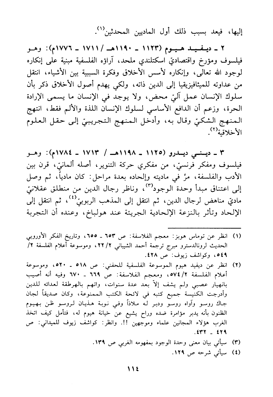 (¬٢) انظر عن ديفيد هيوم الموسوعة الفلسفية للحفني: ص ٥١٨ - ٥٢٠، وموسوعة أعلام الفلسفة ٢/ ٥٧٤، ومعجم الفلاسفة: ص ٦٦٩ - ٦٧٠ وفيه أنه أصيب بانهيار عصبي ولم يشف إلّا بعد عدة سنوات، واتهم بالهرطقة لعدائه للدين وأدرجت الكنيسة جميع كتبه في لائحة الكتب الممنوعة، وكان صديقًا لجان جاك روسو وآواه روسو ودبر له ملاذًا وفي نوبة هذيان لروسو ظن بهيوم الظنون بأنه يدبر مؤامرة ضده وراح يشيع عن خيانة هيوم له، فتأمل كيف اتخذ الغرب هؤلاء المجانين علماء وموجهين! ! . وانظر: كواشف زيوف للميداني: ص ٤٢٩ - ٤٣٢.