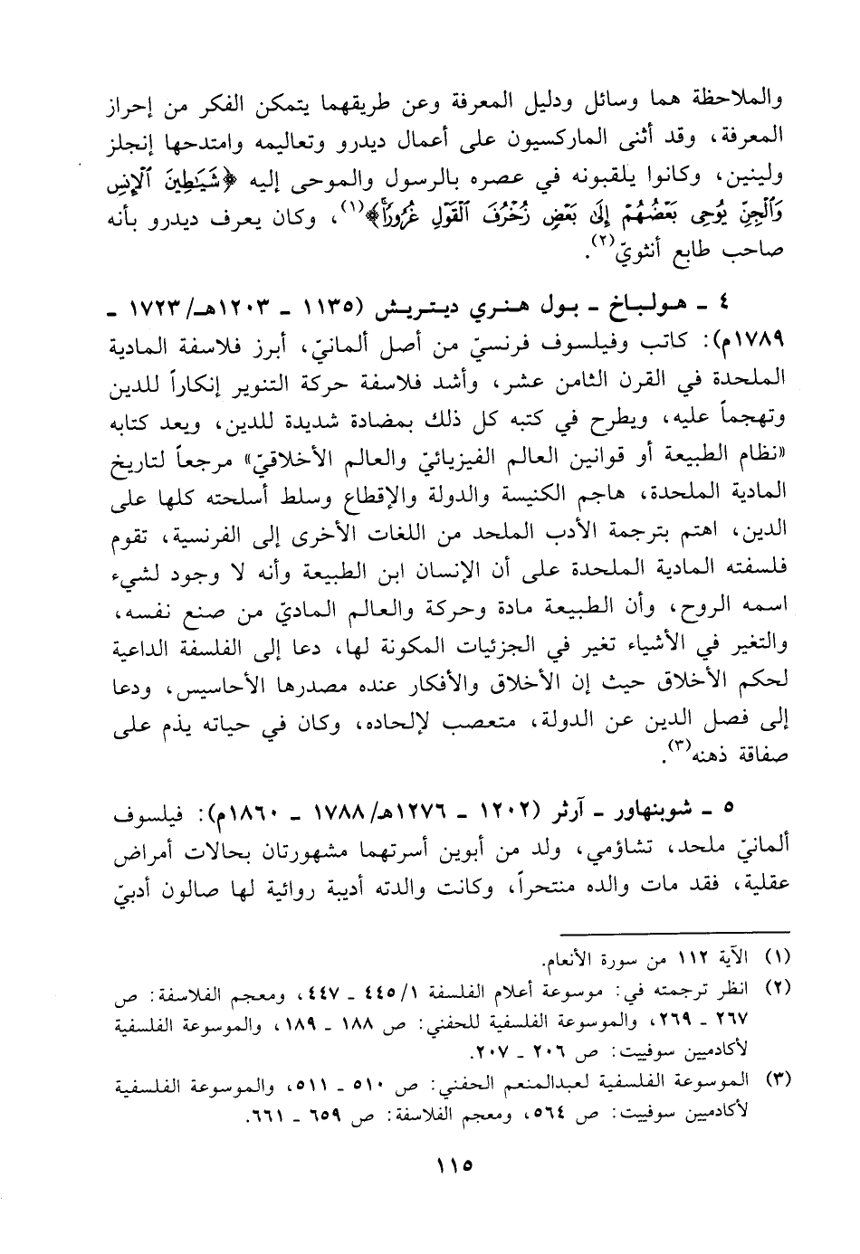 ٤ - هولباخ - بول هنري ديتريش (١١٣٥ - ١٢٠٣ هـ/ ١٧٢٣ - ١٧٨٩ م): كاتب وفيلسوف فرنسي من أصل ألماني، أبرز فلاسفة المادية الملحدة في القرن الثامن عشر، وأشد فلاسفة حركة التنوير إنكارًا للدين وتهجمًا عليه، ويطرح في كتبه كل ذلك بمضادة شديدة للدين، ويعد كتابه "نظام الطبيعة أو قوانين العالم الفيزيائيّ والعالم الأخلاقي" مرجعًا لتاريخ المادية الملحدة، هاجم الكنيسة والدولة والإقطاع وسلط أسلحته كلها على الدين، اهتم بترجمة الأدب الملحد من اللغات الأخرى إلى الفرنسية، تقوم فلسفته المادية الملحدة على أن الإنسان ابن الطبيعة وأنه لا وجود لشيء اسمه الروح، وأن الطبيعة مادة وحركة والعالم الماديّ من صنع نفسه، والتغير في الأشياء تغير في الجزئيات المكونة لها، دعا إلى الفلسفة الداعية لحكم الأخلاق حيث إن الأخلاق والأفكار عنده مصدرها الأحاسيس، ودعا إلى فصل الدين عن الدولة، متعصب لإلحاده، وكان في حياته يذم على صفاقة ذهنه (¬٣).