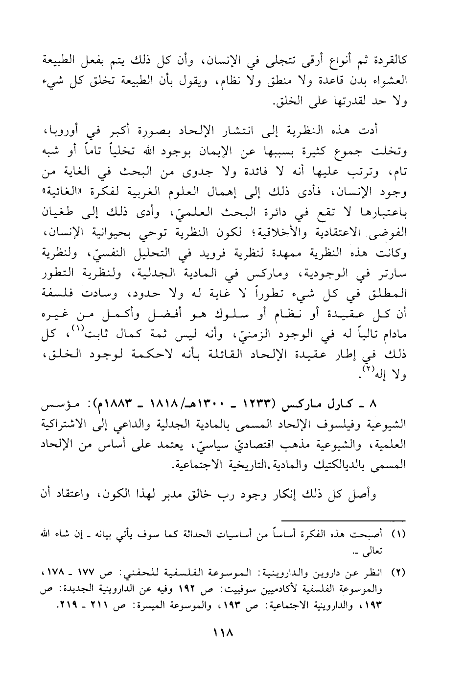(¬٢) انظر عن داروين والداروينية: الموسوعة الفلسفية للحفني: ص ١٧٧ - ١٧٨، والموسوعة الفلسفية لأكادميين سوفييت: ص ١٩٢ وفيه عن الداروينية الجديدة: ص ١٩٣، والداروينية الاجتماعية: ص ١٩٣، والموسوعة الميسرة: ص ٢١١ - ٢١٩.