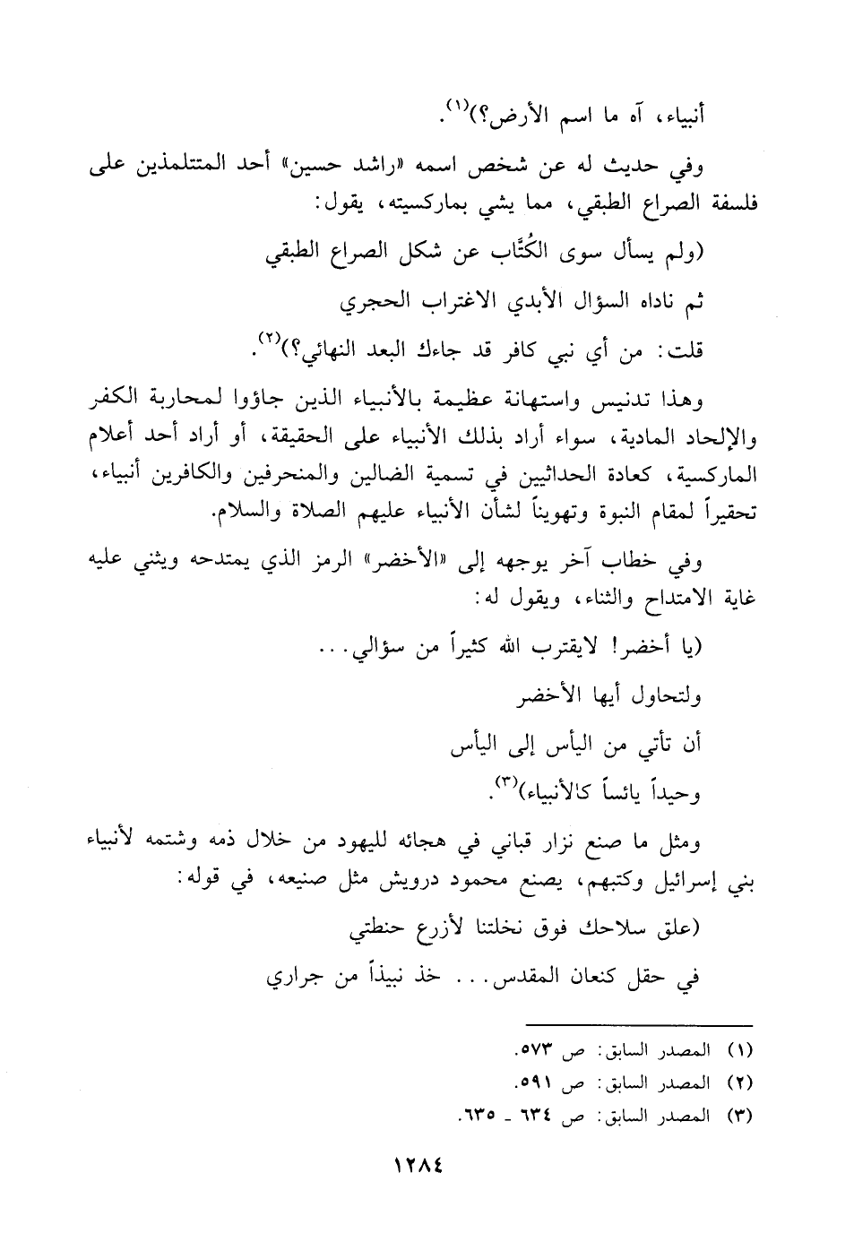 وهذا تدنيس واستهانة عظيمة بالأنبياء الذين جاؤوا لمحاربة الكفر والإلحاد المادية، سواء أراد بذلك الأنبياء على الحقيقة، أو أراد أحد أعلام الماركسية، كعادة الحداثيين في تسمية الضالين والمنحرفين والكافرين أنبياء، تحقيرًا لمقام النبوة وتهوينًا لشأن الأنبياء عليهم الصلاة والسلام.