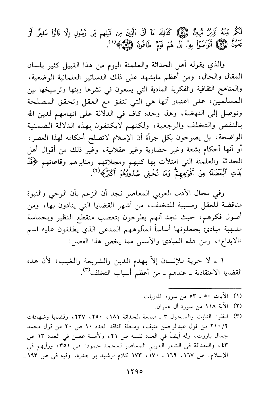والذي يقوله أهل الحداثة والعلمنة اليوم من هذا القبيل كثير بلسان المقال والحال، ومن أعظم ما يشهد على ذلك الدساتير العلمانية الوضعية، والمناهج الثقافية والفكرية المادية التي يسعون في نشرها وبثها وترسيخها بين المسلمين، على اعتبار أنها هي التي تتفق مع العقل وتحقق المصلحة وتوصل إلى النهضة، وهذا وحده كاف في الدلالة على اتهامهم لدين اللَّه بالنقص والتخلف والرجعية، ولكنهم لا يكتفون بهذه الدلالة الضمنية الواضحة، بل يصرحون بكل جرأة أن الإسلام لا تصلح أحكامه لهذا العصر، أو أنها أحكام بشعة وغير حضارية وغير عقلانية، وغير ذلك من أقوال أهل الحداثة والعلمنة التي امتلأت بها كتبهم ومجلاتهم ومنابرهم وقاعاتهم {قَدْ بَدَتِ الْبَغْضَاءُ مِنْ أَفْوَاهِهِمْ وَمَا تُخْفِي صُدُورُهُمْ أَكْبَر} (¬٢).