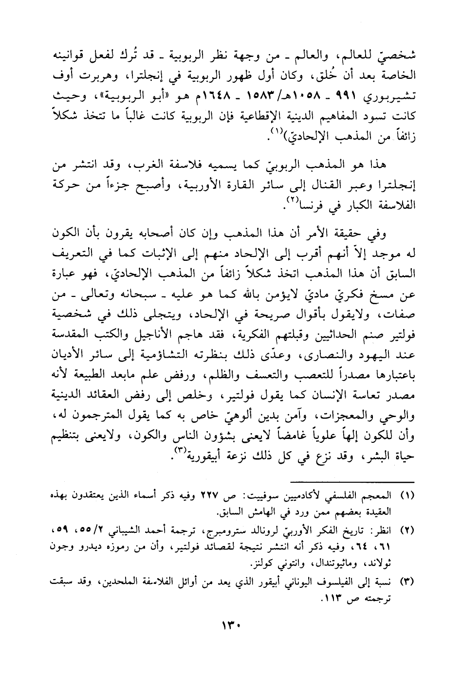 هذا هو المذهب الربوبيّ كما يسميه فلاسفة الغرب، وقد انتشر من إنجلترا وعبر القنال إلى سائر القارة الأوربية، وأصبح جزءًا من حركة الفلاسفة الكبار في فرنسا (¬٢).
