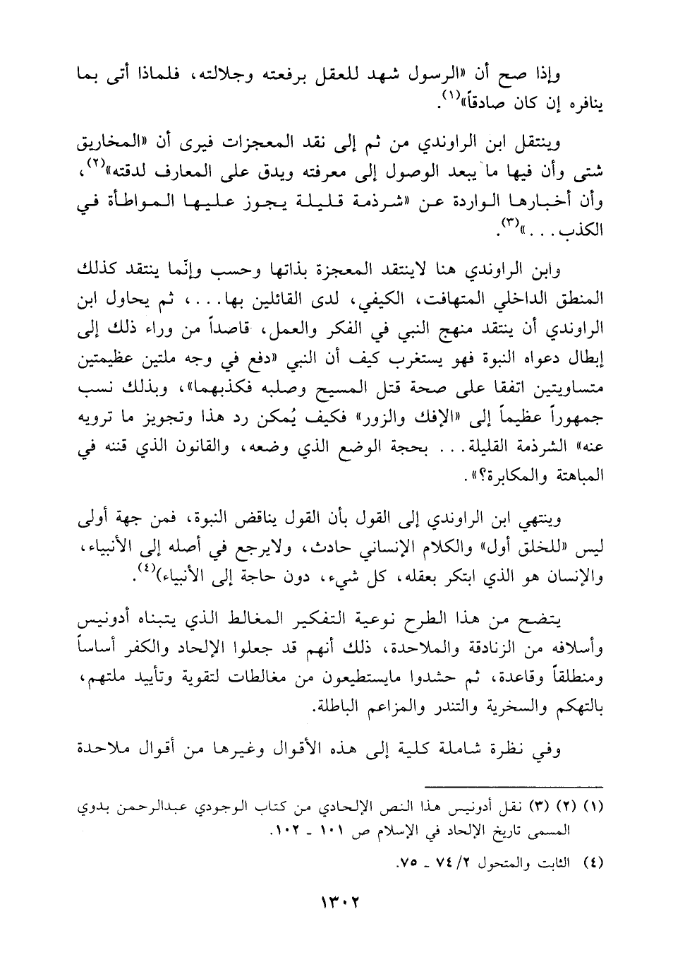 (¬١) و (¬٢) و (¬٣) نقل أدونيس هذا النص الإلحادي من كتاب الوجودي عبد الرحمن بدوي المسمى تاريخ الإلحاد في الإسلام ص ١٠١ - ١٠٢.