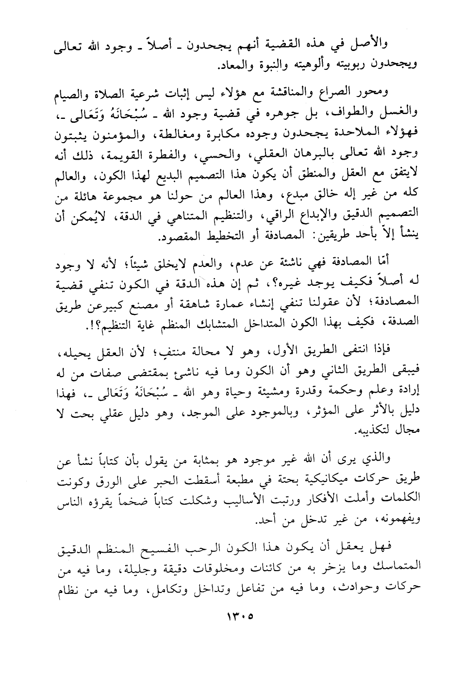 والذي يرى أن اللَّه غير موجود هو بمثابة من يقول بأن كتابًا نشأ عن طريق حركات ميكانيكية بحتة في مطبعة أسقطت الحبر على الورق وكونت الكلمات وأملت الأفكار ورتبت الأساليب وشكلت كتابًا ضخمًا يقرؤه الناس ويفهمونه، من غير تدخل من أحد.