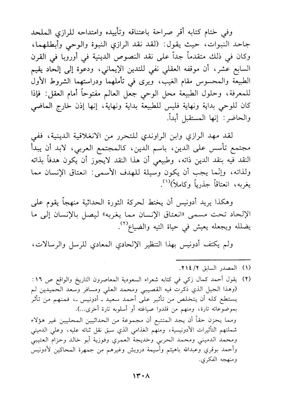 وفي ختام كتابه أقر صراحة باعتناقه وتأييده وامتداحه للرازي الملحد جاحد النبوات، حيث يقول: (لقد نقد الرازي النبوة والوحي وأبطلهما، وكان في ذلك متقدمًا جدًا على نقد النصوص الدينية في أوروبا في القرن السابع عشر، أن موقفه العقلي نفي للتدين الإيماني، ودعوة إلى إلحاد يقيم الطبيعة والمحسوس مقام الغيب، ويرى في تأملهما ودراستهما الشروط الأول للمعرفة، وحلول الطبيعة محل الوحي جعل العالم مفتوحًا أمام العقل: فإذا كان للوحي بداية ونهاية فليس للطبيعة بداية ونهاية، إنها إذن خارج الماضي والحاضر: إنها المستقبل أبدًا.