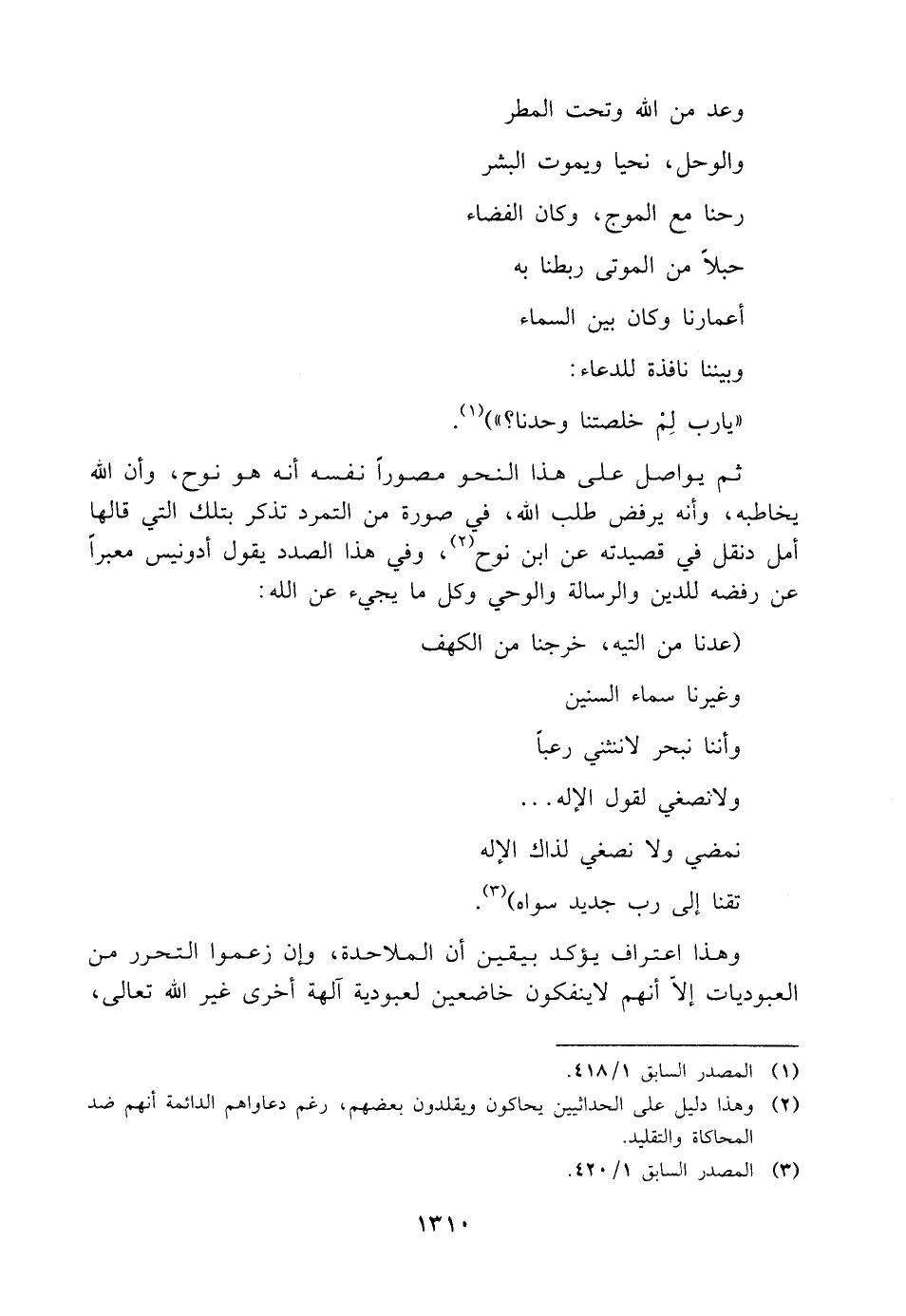 ثم يواصل على هذا النحو مصورًا نفسه أنه هو نوح، وأن اللَّه يخاطبه، وأنه يرفض طلب اللَّه، في صورة من التمرد تذكر بتلك التي قالها أمل دنقل في قصيدته عن ابن نوح (¬٢)، وفي هذا الصدد يقول أدونيس معبرًا عن رفضه للدين والرسالة والوحي وكل ما يجيء عن اللَّه:
